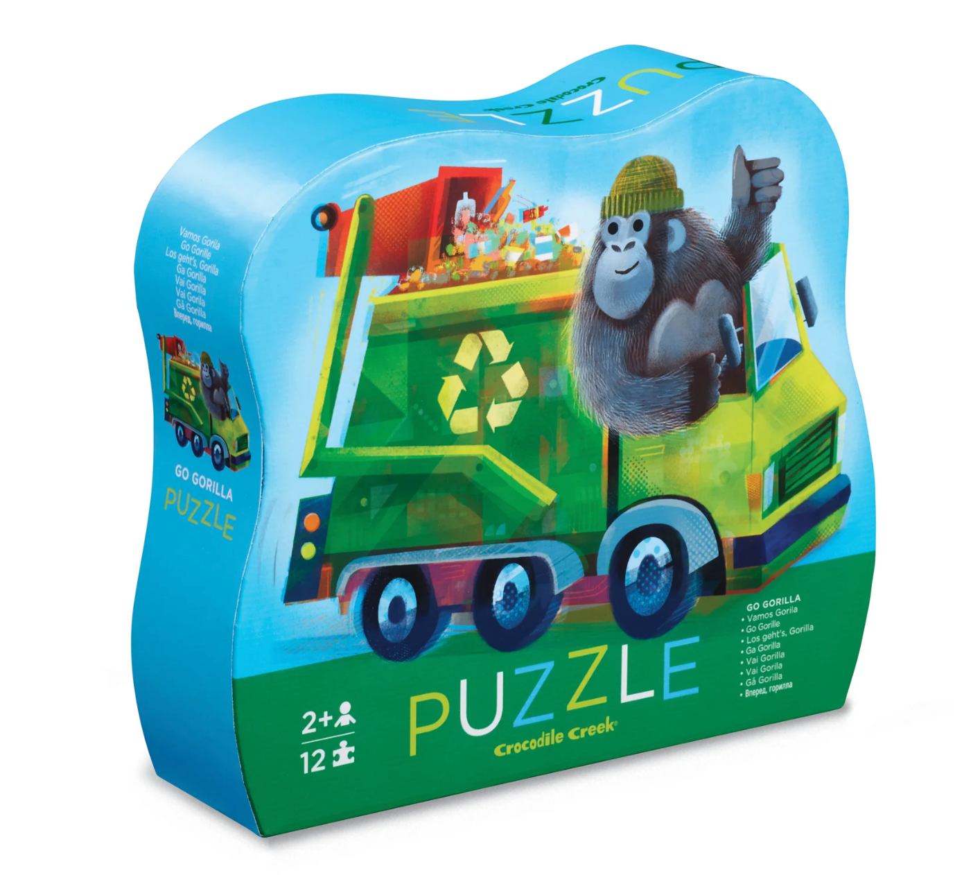 Go Gorilla! Our Recycling Gorilla puzzle will delight any little enthusiast wowed by the recycling and trash trucks roaming the local streets and neighborhoods! Featuring bold colors and a whimsically illustrated puzzle that encourages hand-eye coordination and problem-solving. Great for interaction between a parent and child that can be used over and over. A sturdy box makes for easy storage and its small size is perfect for travel.