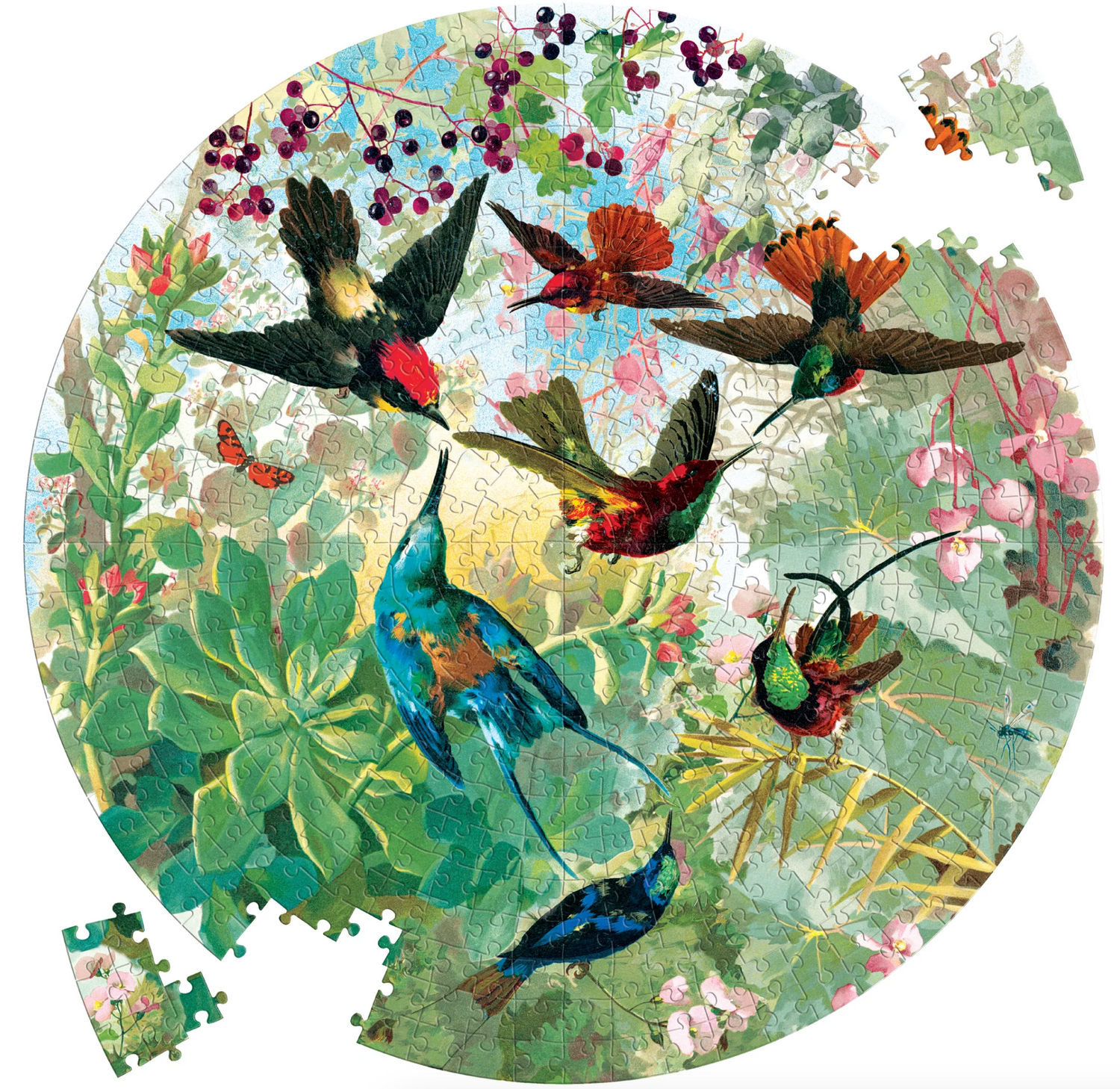 Take on the extra challenge of a round jigsaw puzzle inspired by vintage ornithological illustrations. This beautiful garden full of hummingbirds in flight will transport any family of puzzlers into focused calm.