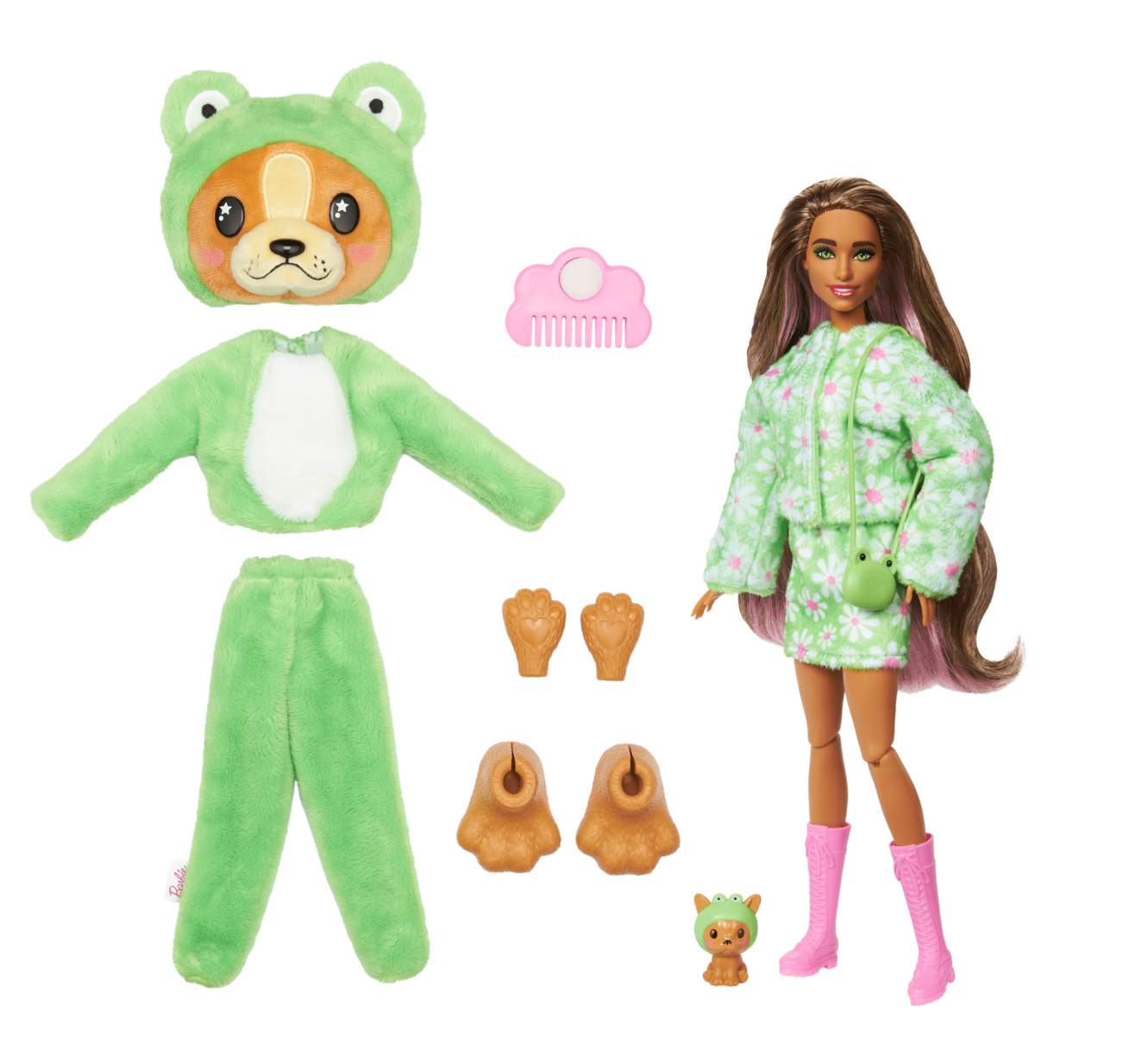 Barbie Cutie Reveal animal costume-themed dolls offer the cutest unboxing experience with 10 surprises! Discover a Kitten in a Red Panda costume, a Dog as a Frog, a Teddy Bear as a Dolphin or a Bunny as a Koala. Remove the plush costume to reveal a posable Barbie doll with long, colorful hair. Discover more surprises to open like a pair of shoes, a purse and a matching mini pet. Reverse the plush top for a fleece jacket and flip the costume head for a pet bed. Icy cold water adds even more cuteness with color-change transformations on the doll's face and mini pet; warm water changes them back for repeat fun! Kids will love discovering -- and collecting -- all the cute surprises in this adorable Barbie Cutie Reveal series. Each doll sold separately, subject to availability. Dolls cannot stand alone. Colors and decorations may vary. Ages 3 and up.