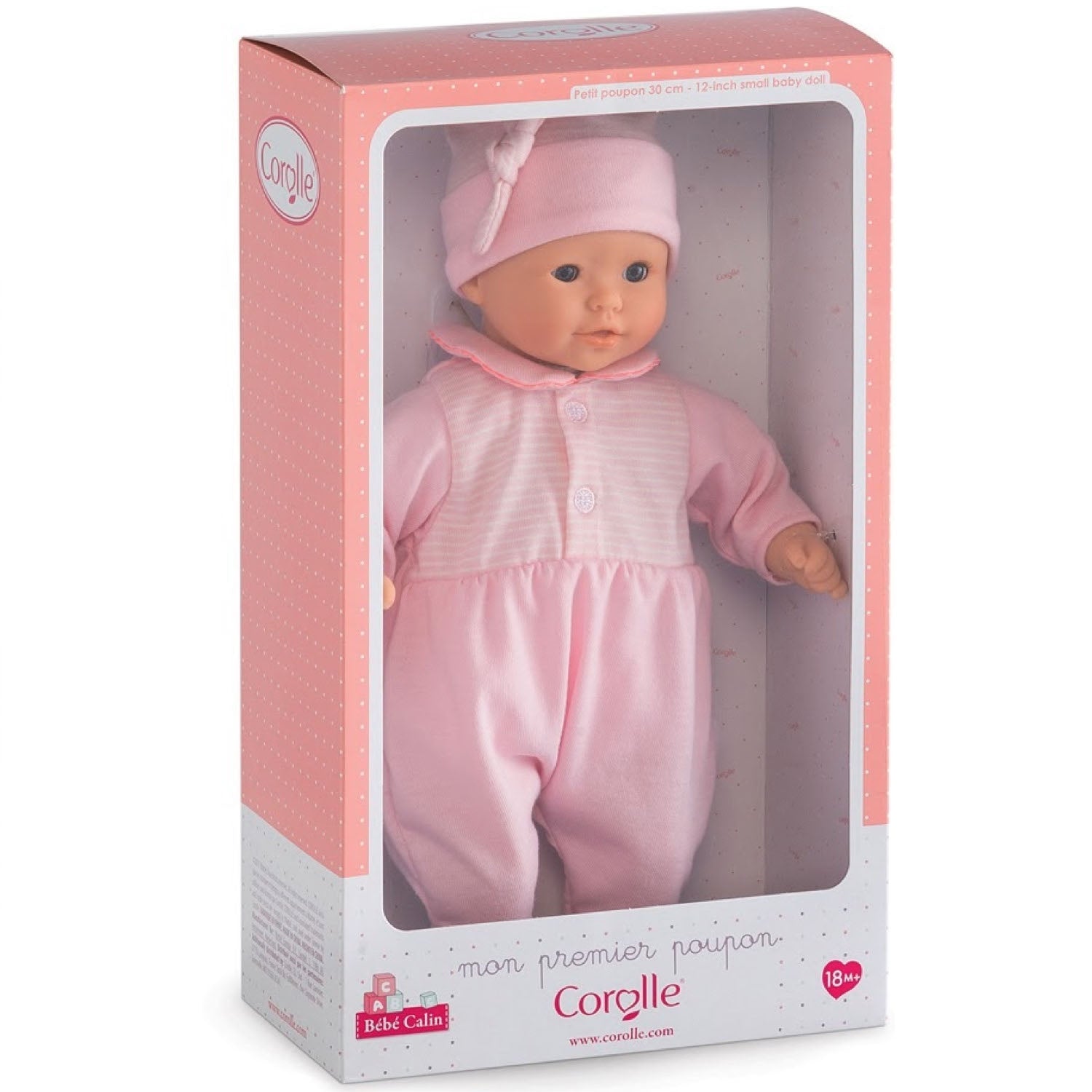From 18 months, Mon Premier Bébé Calin Charming Pastel is the ideal first doll for little mommies. Measuring 12 inches, she's the perfect size to rock or cuddle in your child's arms. She can be posed exactly like a real baby with her soft supple body. Her face, arms and legs are made of touchably soft vinyl. The doll is delicately vanilla scented, ready to make your child's doll hugs as sweet and memorable as you and your child's. With sleepy eyes, she sleeps when she's laid on her back. Little mommies and daddies can give her the pacifier when she's fussy. This baby doll is wearing pyjamas and has a bonnet. Mon Premier Bebe Calin Charming Pastel is so trendy with the bright pink trim on the collar of her pyjamas.