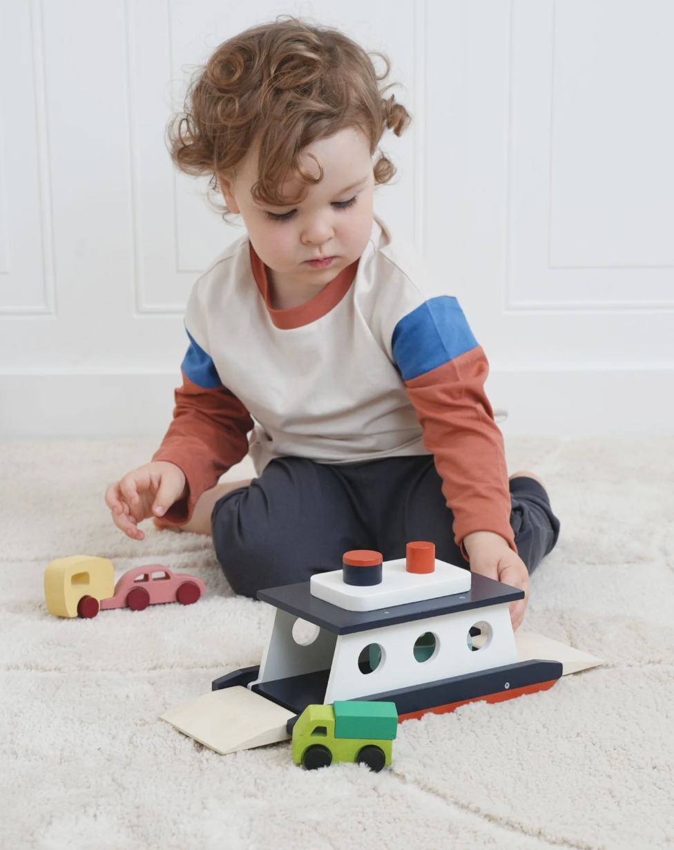 A stylish car ferry with 2 funnels and round windows with loading and unloading both ends. Transport a brightly coloured car and caravan, a camper van and a truck across the waters. Imaginative play and fine motor skills.