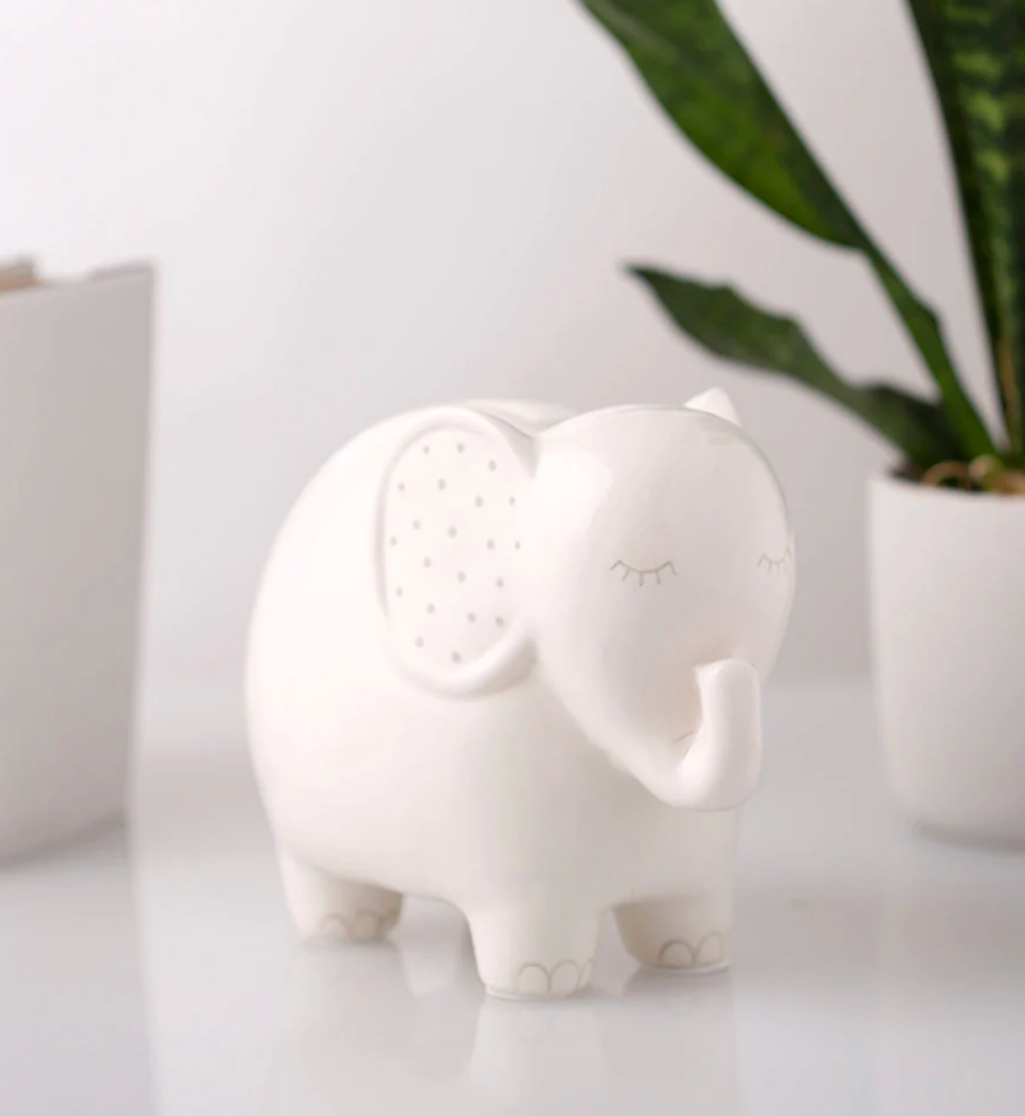 Save early! With a removable rubber stopper to keep your savings safe, this elephant-shaped ceramic bank is a classic beauty in white with charming gray accents. Its dimensions are 7.75” W x 6.25” H x 5” D, perfect for ages 3 and up.