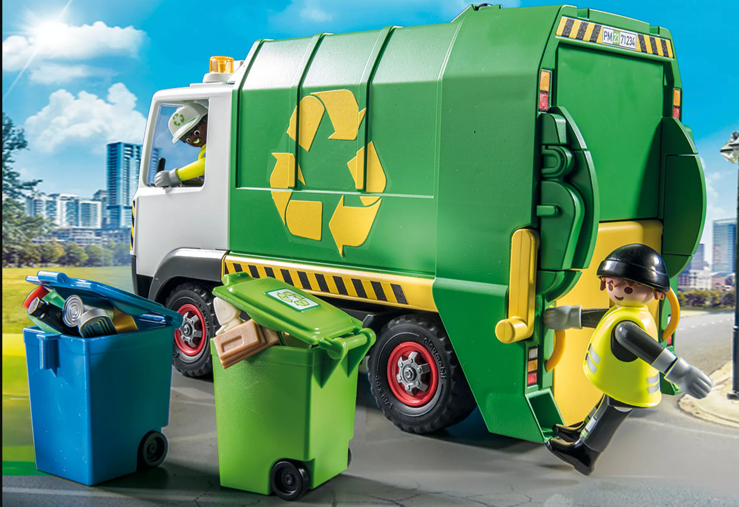 Help keep the city clean with the PLAYMOBIL Recycling Truck. This PLAYMOBIL City Life Recycling Truck comes with many realistic features, such as two bins and lots of garbage to collect and recycle. Help the sanitation workers to load the bins on the back of the truck and then pull the lever to lift and empty each container. To empty the vehicle, the entire container is tilted up and the rear attachment is lifted. Easily access the driver's cab thanks to the removable roof. Two members of the sanitation department can ride in the vehicle. Just like the real thing: The figures can stand on the left and right at the rear of the vehicle, holding on to the grab handle while driving.