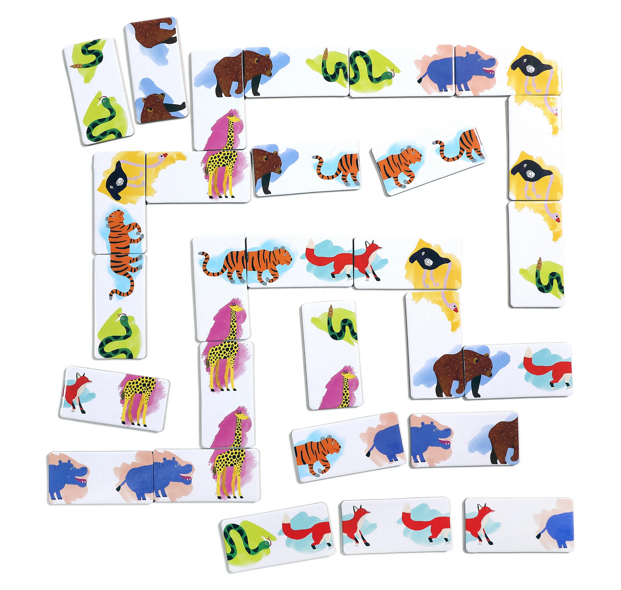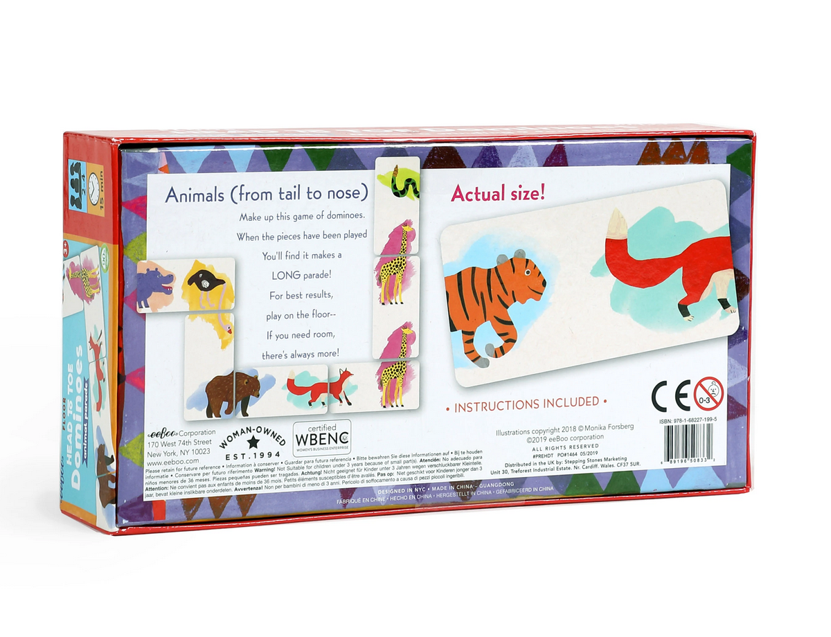 Take this Animal Parade everywhere you go! From snakes to giraffes, our Animal Parade Head to Toe Dominoes will delight children at home, at Grandpa's house, or on vacation. A great little size to toss in your bag and take on the go. Illustrated by Monika Forsberg