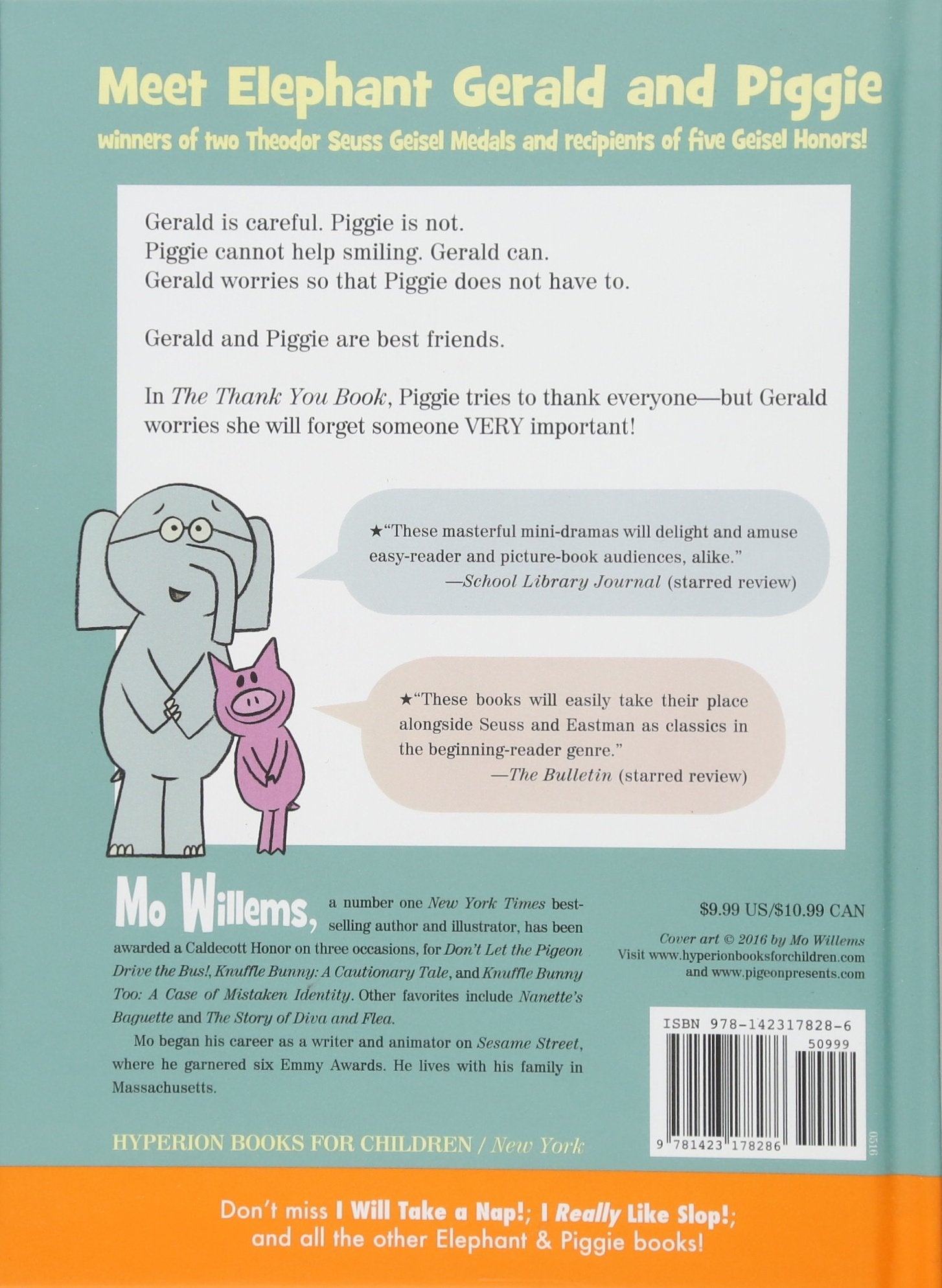 In The Thank You Book!, Piggie wants to thank EVERYONE. But Gerald is worried Piggie will forget someone . . . someone important.