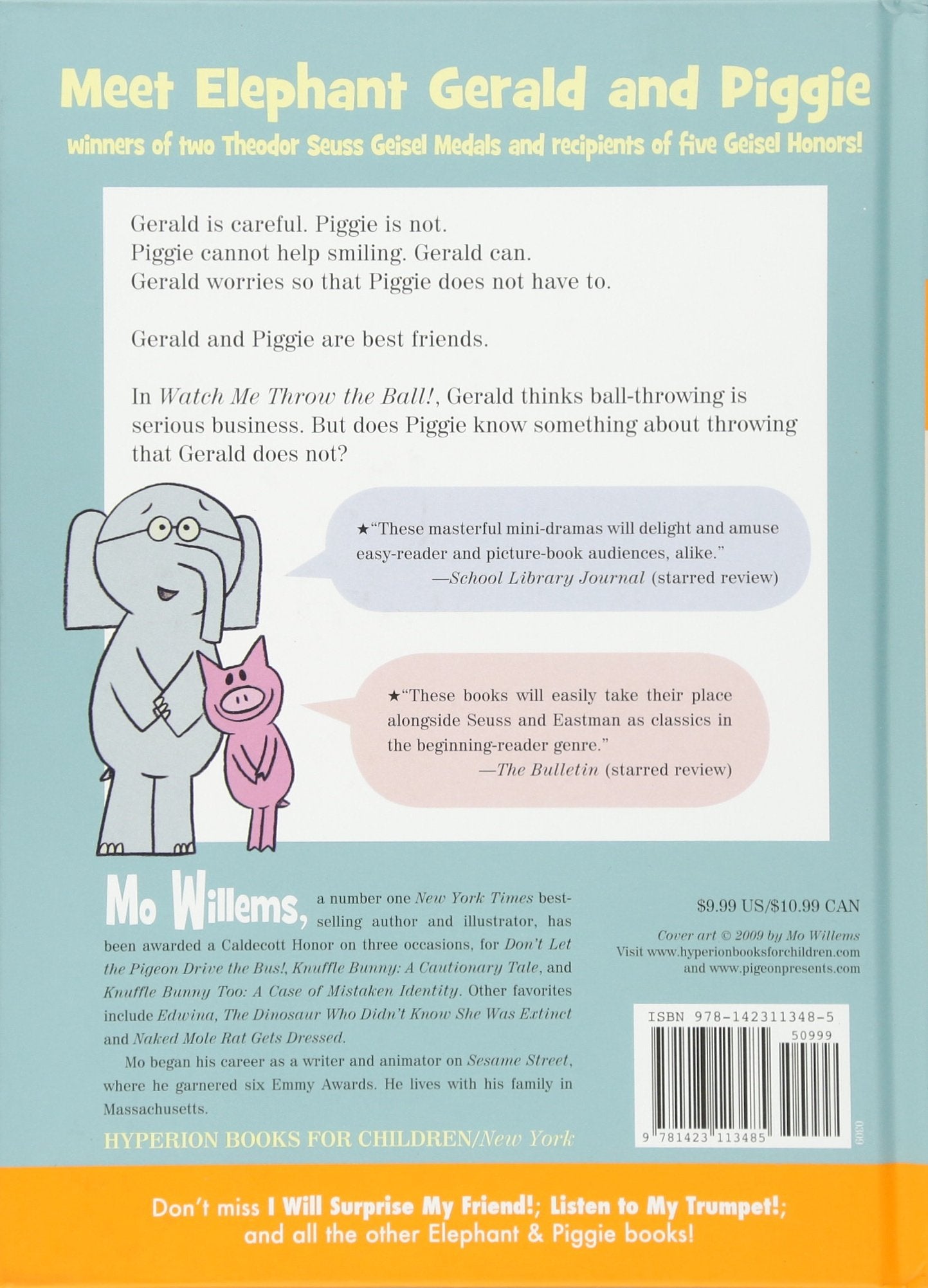 In Watch Me Throw the Ball!, Gerald is determined to teach Piggie that ball-throwing is serious business... but Piggie is just as determined to have serious fun.
