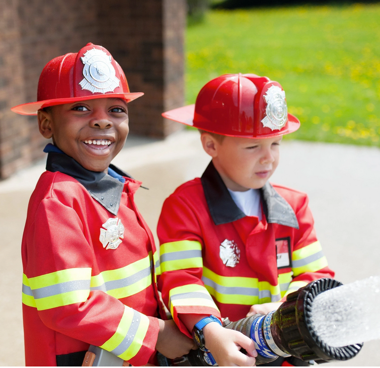 Sound the alarm! And suit up to fight ferocious pretend fires in this full firefighter outfit. Look the part in this complete 5 piece dress-up-and-play set. The set includes a red coat with reflective tape details, plastic firefighter hat with emblem, removable personalized name badge, play axe, and play fire extinguisher (which is actually a water gun!). The coat even comes with the matching plastic firehouse badge. All our Great Pretenders Career Costumes are packaged in a reusable blue garment bag for easy storage. 5 Piece Set: coat, helmet, axe, fire extinguisher and badge. Size 5/6