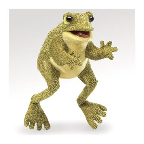 Ready for mischief, this frog puppet begs for your attention with expressive eyes and wide open smile. Donned in a hip, chartreuse, textured fabric all the way to his gangly feet, this comical character comes to life with movable mouth and front legs. Measures 12 inches tall. Ages 3 and up. Does not stand.
