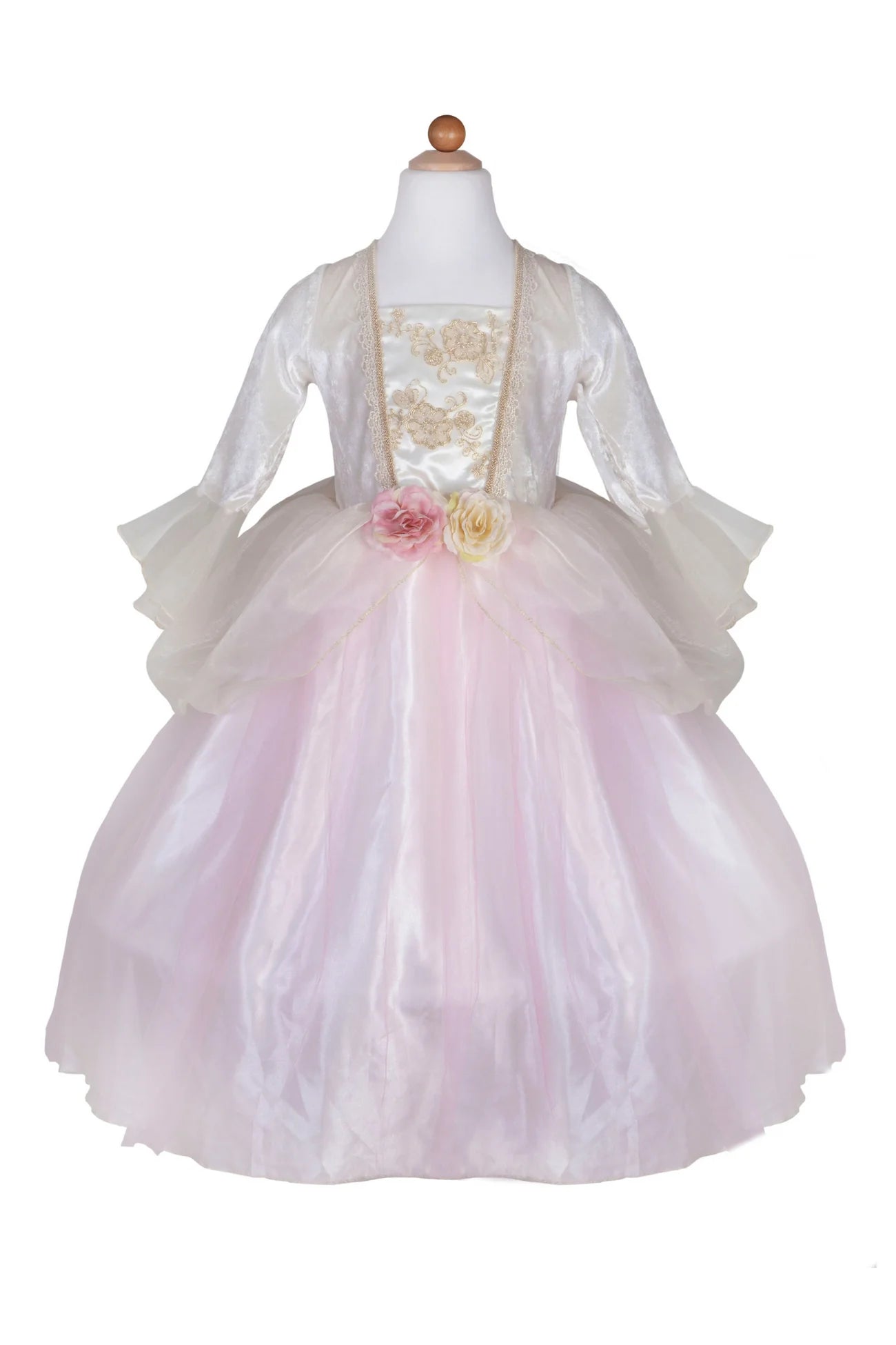 This absolutely stunning and elegant dress is designed with great attention to the finest details. The soft and silky skirt has a hoop and a shimmery top layer with a sparkly peplum. The crushed velvet bodice has a satin inset embellished with gold embroidery and finished with fancy golden trims. Elasticized waistband is adorned with pink and champagne-colored roses at the front. This gown is dreamy and it’s dream come true for all little princesses!
