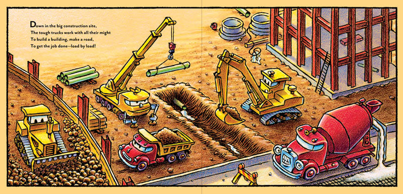 As the sun sets behind the big construction site, all the hardworking trucks get ready to say goodnight. One by one, Crane Truck, Cement Mixer, Dump Truck, Bulldozer, and Excavator finish their work and lie down to rest—so they'll be ready for another day of rough and tough construction play! With irresistible artwork by best-selling illustrator Tom Lichtenheld and sweet, rhyming text, this book will have truck lovers of all ages begging for more. Hardcover. Suggested ages 3-6.