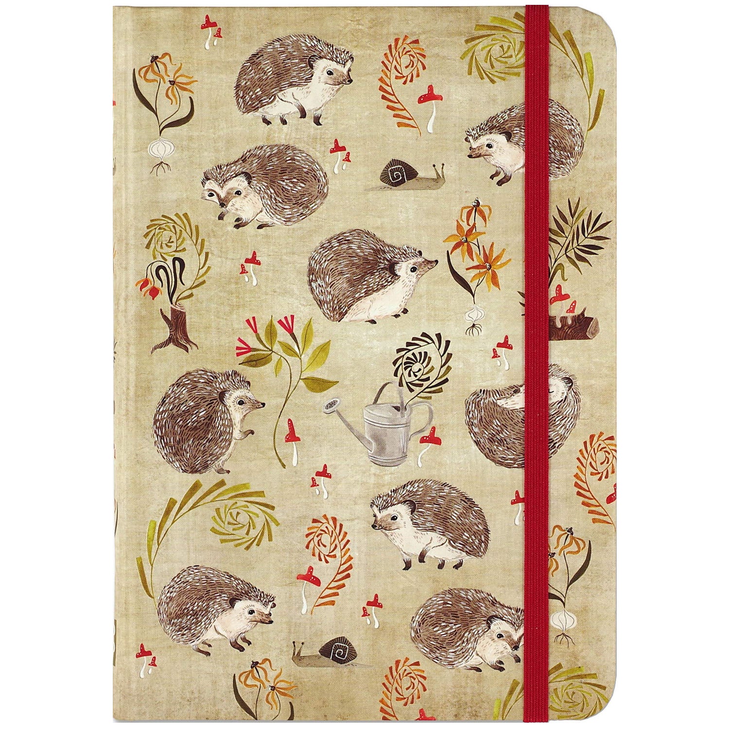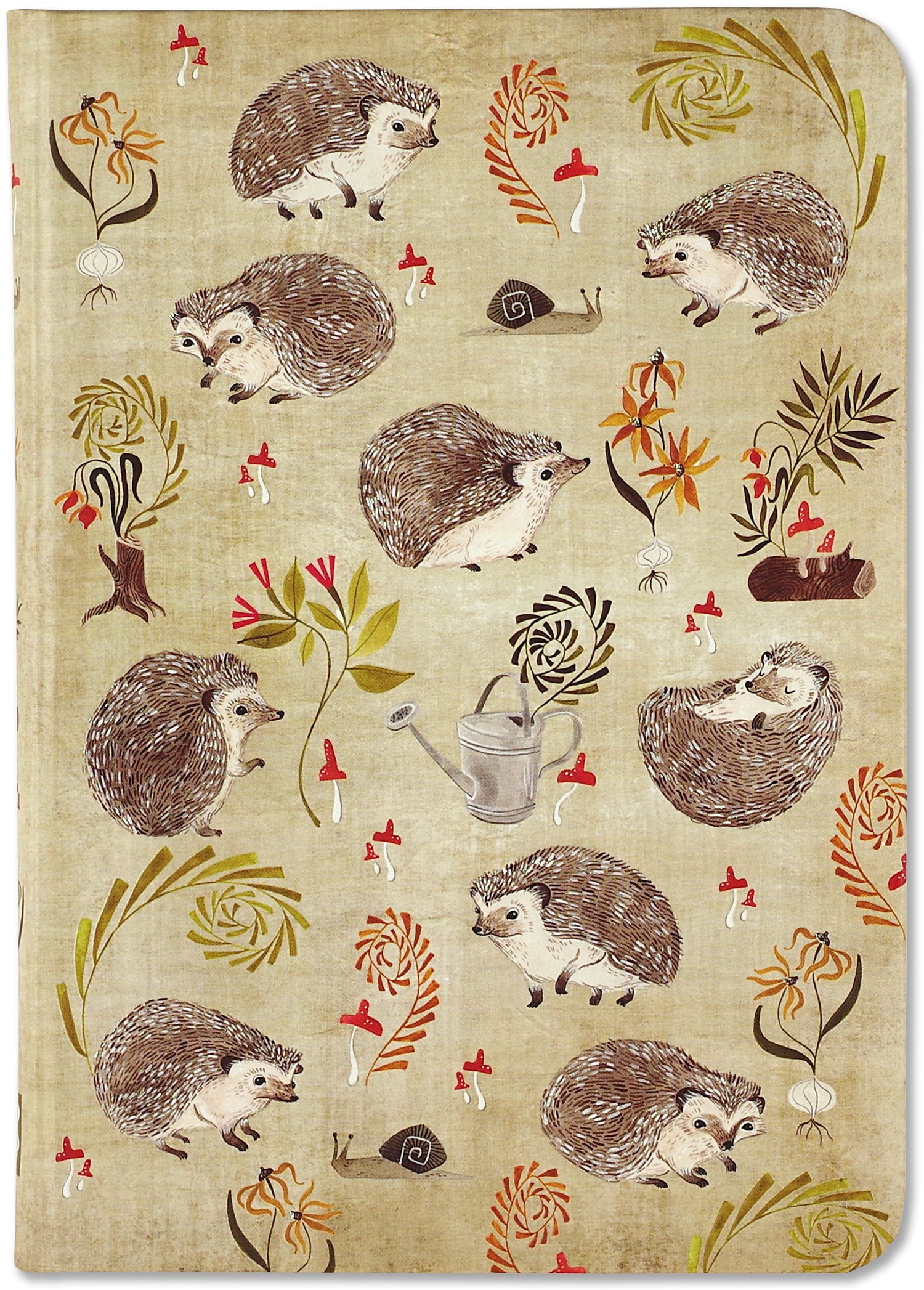 The cover of this charming journal features images of hedgehogs, snails, mushrooms, and other woodland motifs.