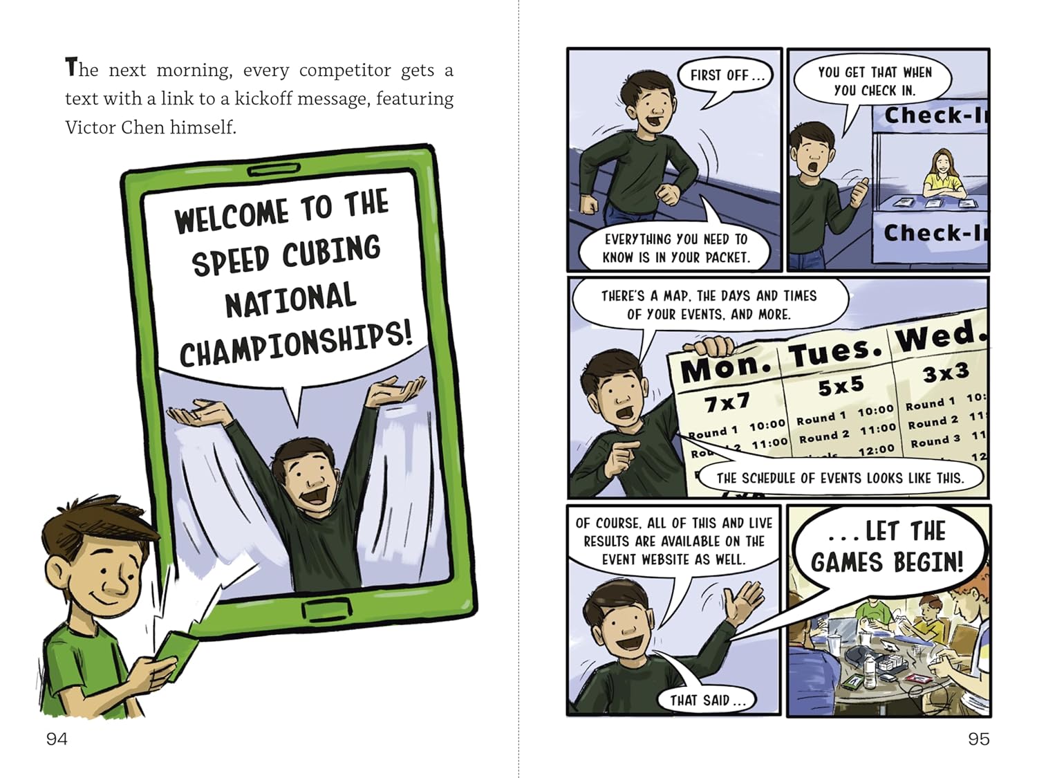 Despite qualifying for the Speed Cubing National Championships in Las Vegas, twelve-year-old Tyler Goodman and his mom don’t have the money to get him there. That is, until the retailer CubeMania offers him one of their coveted all-expenses-paid sponsorships! But getting to Vegas is just the beginning: There are hundreds of speed cubers from around the country, and each has something to prove. Like Dirk, who's certain he's about to nab his third straight National Championship trophy. Lizzy and Izzy Peterson, twins who crush cubing competitions with the exact same moves and times—until one of them decides to break the mold. Renowned eight-year-old prodigy Eli Newton solved his first puzzle cube at five, yet his dad seems much more excited about the sport and there’s something . . . off about his cubes. And then there’s Miles Oldman, the first American to solve the cube in under 40 seconds, who’s back decades later to set some new records. As Lucky Scramble moves with lightning speed between the stories of these six contestants—plus that of CubeMania’s founder and CEO Victor Chen—puzzle cube devotees and fans of graphic novels alike won’t be able to resist racing through the pages until the very last cube has been solved.