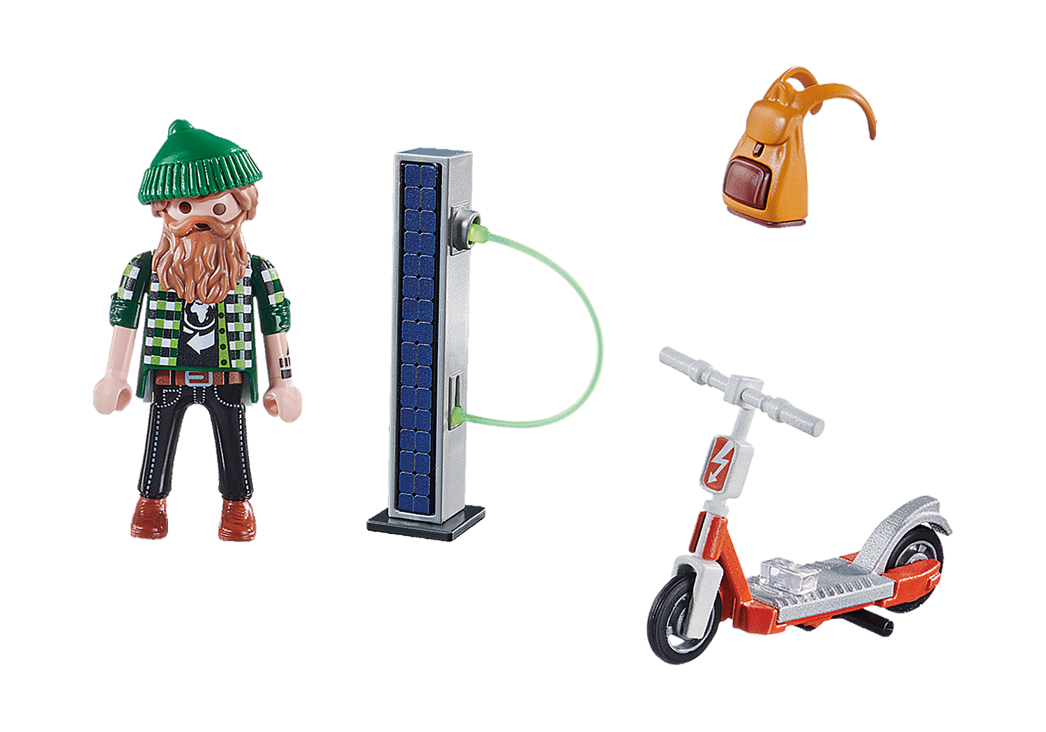 Take a ride with the Playmobil Man with E-Scooter Special Plus Figure! Complete with charger, this bearded man is ready to take a ride in the city with his green hat and greener transportation!