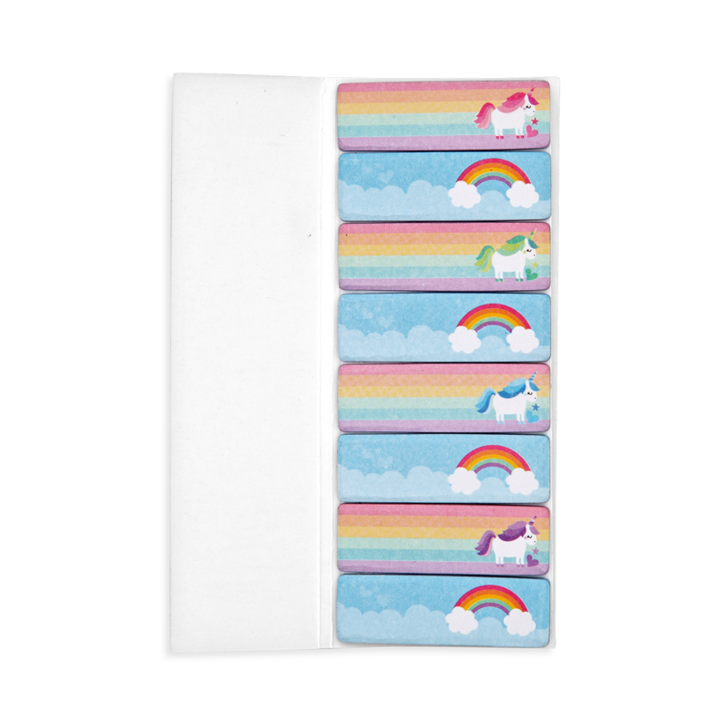 - Mini sticky tabs with 8 unicorn and rainbow designs