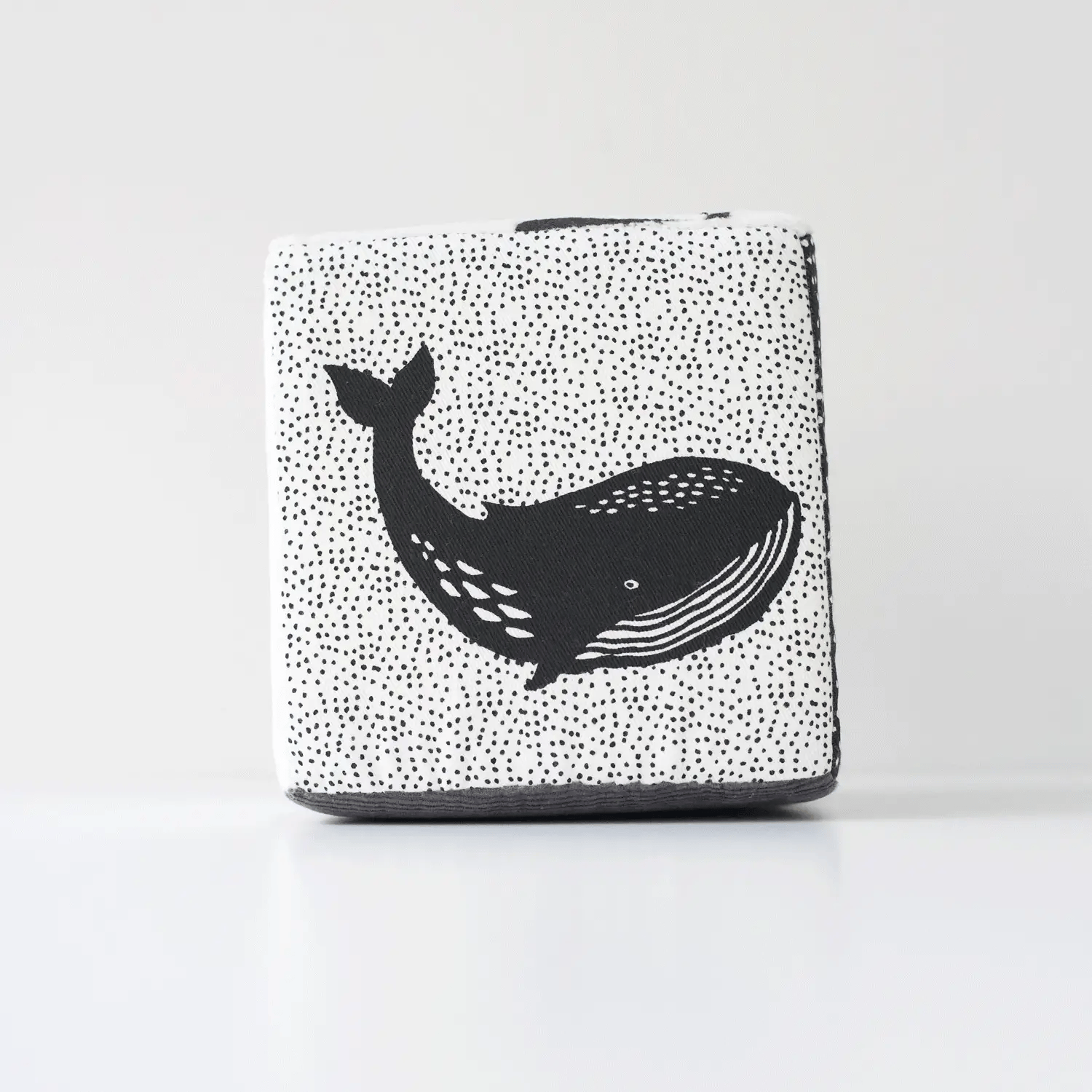 Whale, octopus, ocean waves! So much to do and see in one large block. This soft fabric block is designed to delight baby's developing senses with high-contrast graphics, textures, taggies, and crinkles. Featuring multiple scenes and patterns of ocean life and animals.