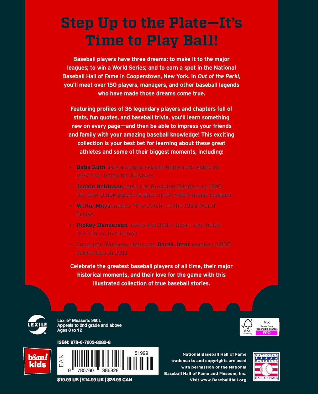 Officially licensed with the Hall of Fame, Out of the Park! follows the incredible careers and lives of your favorite ballplayers, from Babe Ruth to Derek Jeter. Organized by key aspects of the game, each chapter features biographical snapshots of four players who excelled in that arena--from hitting to fielding to leadership on and off the field--as well as fun facts, historical trivia, infamous quotes, important stats and baseball lingo, and photos from the Hall of Fame's collection.