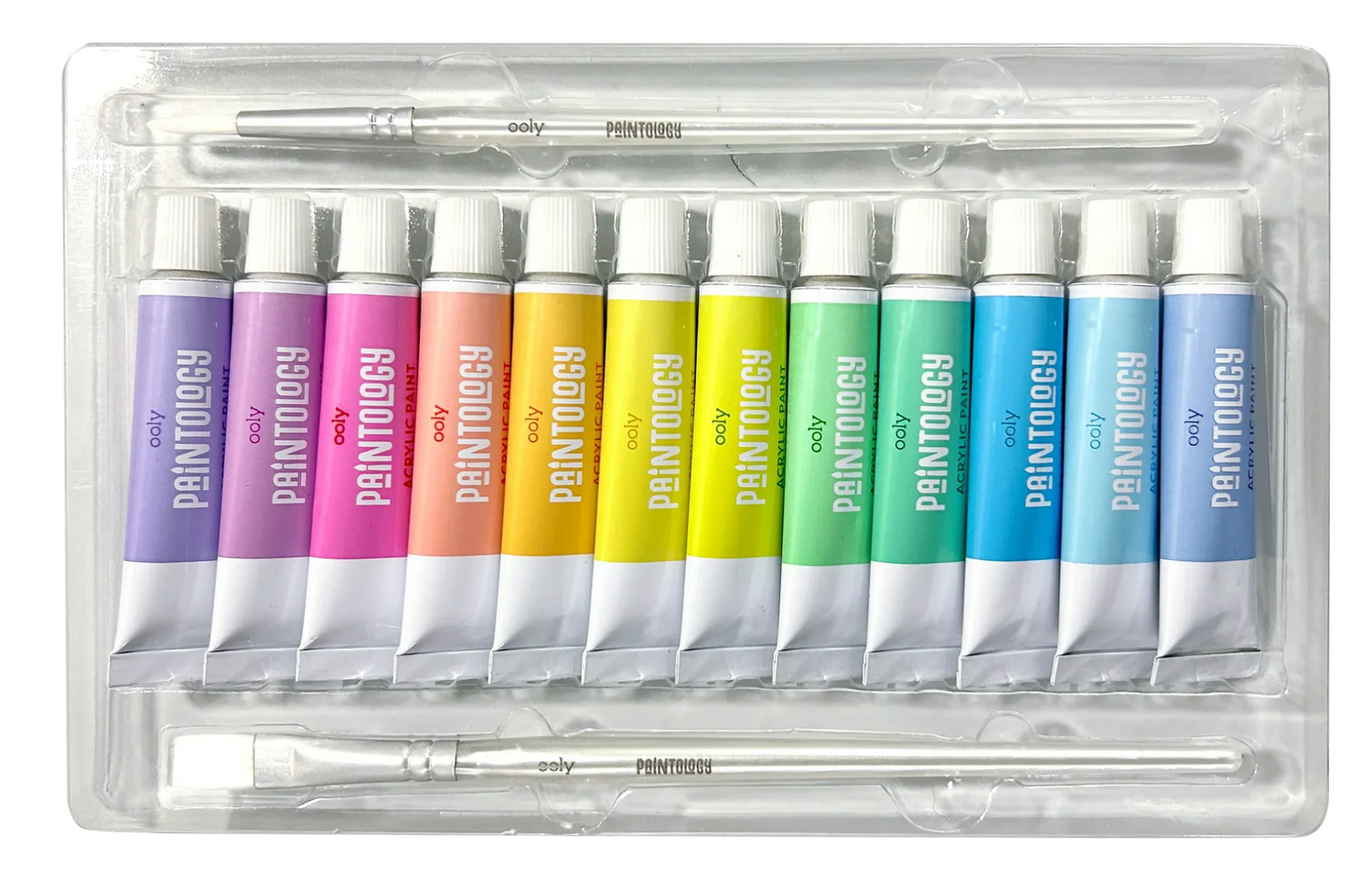 - Kit includes 12 acrylic pastel colored paint tubes, 2 paint brushes (one thin and one broad)