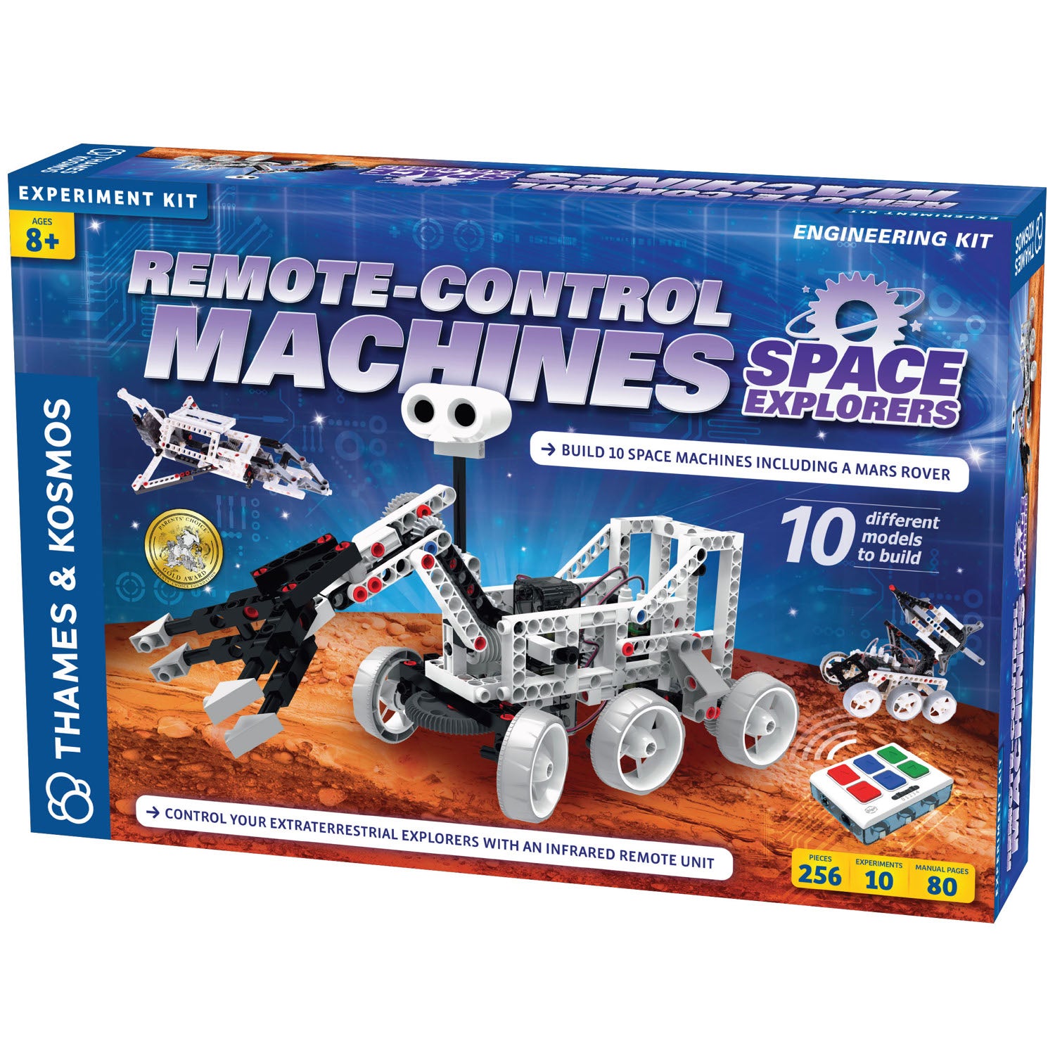 Ready your courageous robots for a mission to the moon, Mars, or beyond! With this engineering kit, you can build a remote-controlled model of a robotic rover resembling the ones used to explore Mars. Deploy your Mars rover in the backyard or sandbox and use the remote control unit to survey the uncharted terrain! The remote can control up to three motors, which move the rover back and forth, turn the wheels to steer the rover, and control the robotic arm to pick up extraterrestrial specimens like small rocks.