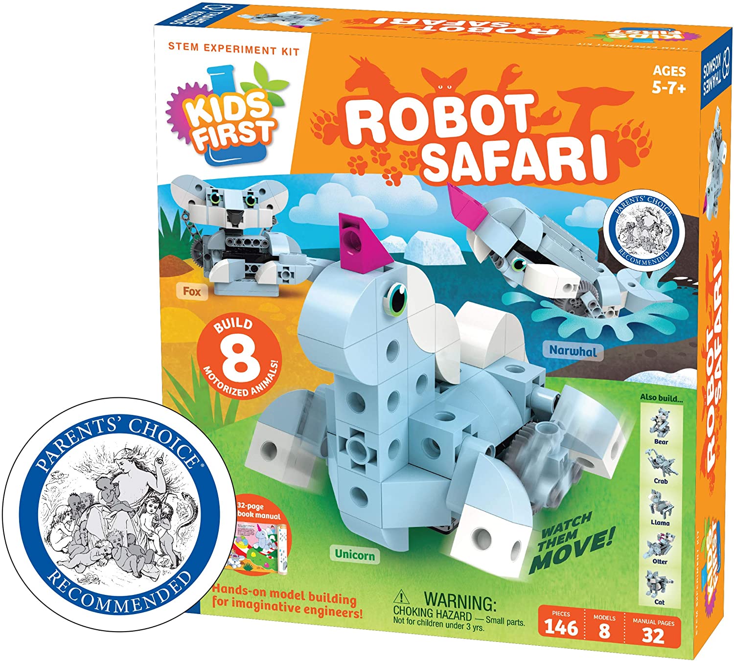 Build a series of adorable, motorized robotic animals with this introductory mechanical engineering kit for kids ages five and up. A beautifully illustrated 32-page storybook centers around the adventures of the Omegas - the family of makers and engineers featured in other Kids First early engineering kits.