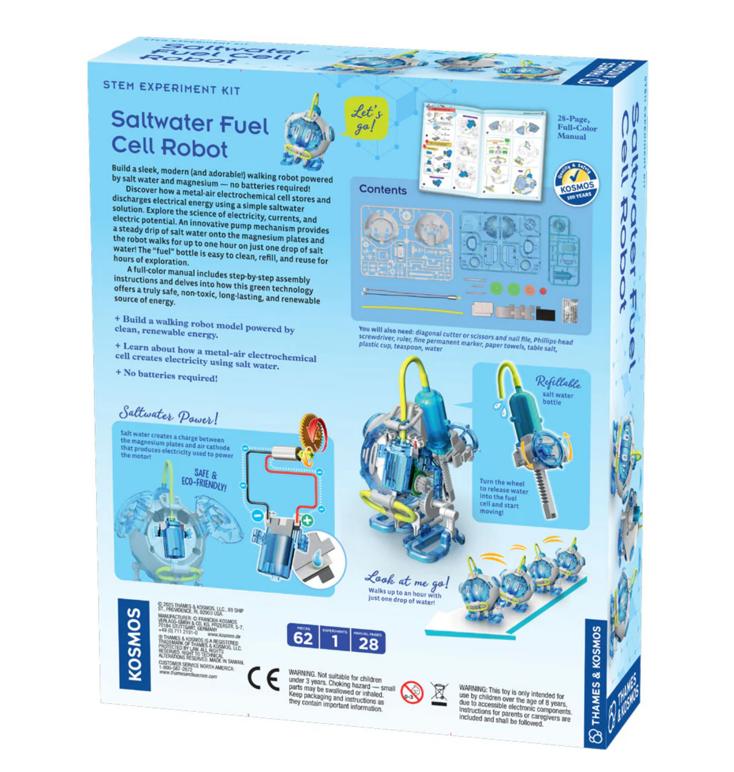 Discover how a metal-air electrochemical cell stores and discharges electrical energy using a simple saltwater solution. Explore the science of electricity, currents, and electric potential. An innovative pump mechanism provides a steady drip of salt water onto the magnesium plates and the robot walks for up to one hour on just one drop of salt water! The “fuel” bottle is easy to clean, refill, and reuse for hours of exploration.