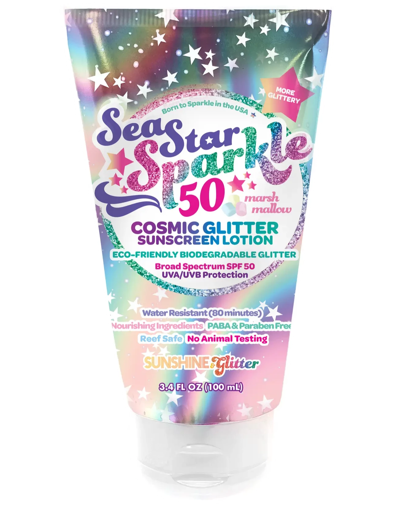 SeaStar Sparkle SPF50 Marsh Mallow scented with Cosmic Iridescent Reef Safe Bio-Degradable Glitter 3.4 oz. | You’re eco-friendly, gorgeous, well protected and sparkling. This super fun bio-degradable glitter sunscreen is nourishing and loaded with antioxidants, provides broad spectrum UVA/UVB protection and 80 minutes of water resistance. PABA and Paraben free, non irritant glitter and smells delicious. Fabulous skin protection as fun and amazing as you are. LOVE IT! Marsh Mallow fragrance with Cosmic Iridescent bio-degradable glitter.