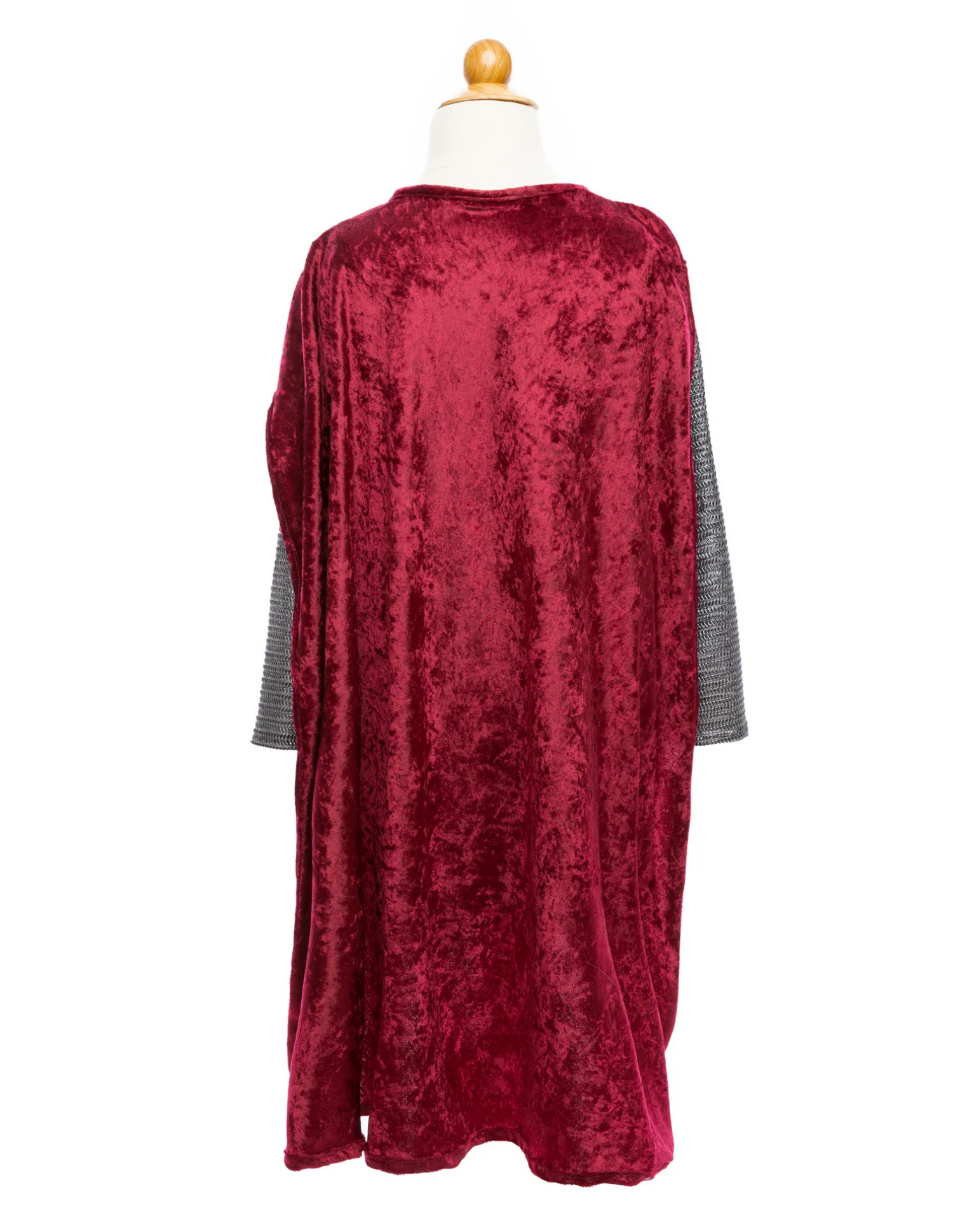 The Silver Knight Tunic and Cape. The tunic is adorned with shimmering silver accents and a regal crest, while the rich red velour cape adds a touch of elegance and drama to the ensemble. The sleeves and bodice are made of an epic chainmail-like material to protect your skin in battle. Embrace the spirit of chivalry and bravery as you don this majestic outfit and embark on epic quests and daring escapades