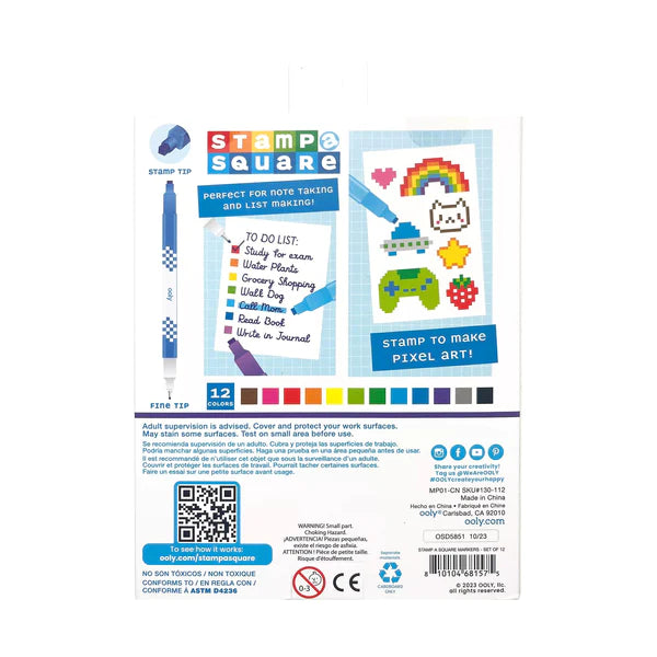 Now you can make the pixel art of your dreams with these stamp a square markers! And the fun doesn't stop there! One end of the non-toxic marker is designed as a square-shaped stamp, while the other is a fine tip (0.8 mm) that's perfect for writing and drawing. Note takers and list makers will love how the stamping end provides an easy way to create a checklist or make bullet points. Includes a set of 12 combo stamp markers. For ages 6 and up.