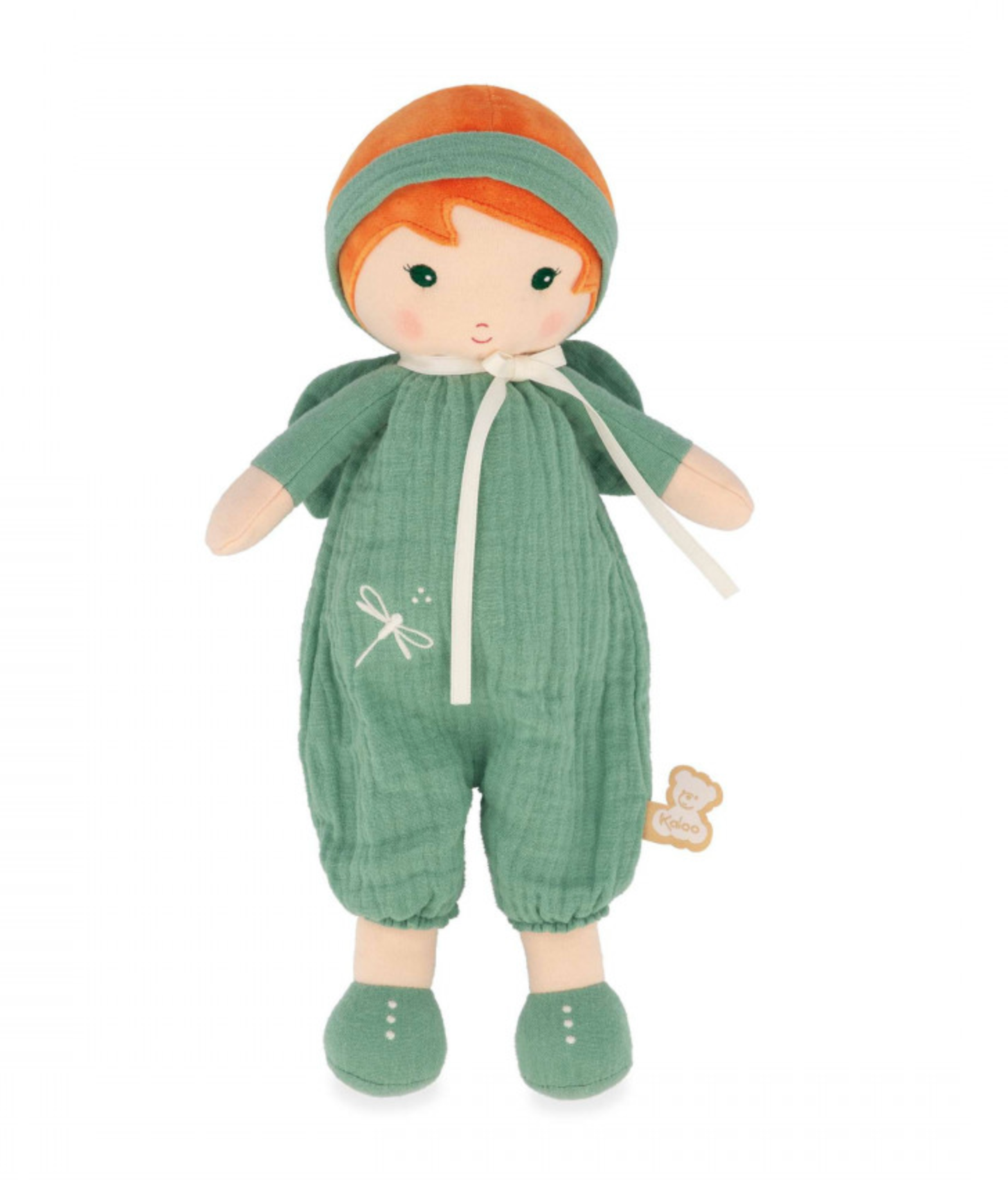 Olivia is the fabric doll that invites you to go for a walk in nature. She measures 12,48 inches and is suitable for babies from birth. She loves the great outdoors and is dressed in pretty olive green dungarees embroidered with a pretty dragonfly. Olivia wears pretty shoes for a walk in the fields, and protects her hair from the wind with an elegant headband. Olivia celebrates values such as nature, freedom and authenticity. Around her neck is a pretty ribbon on which you can write baby's name. The size of this baby doll makes it ideal for cuddling, and little hands can easily grab it by the arms or legs. The Olivia doll is made from polyester and cotton. It is machine washable at 30° and comes in a beautiful gift box, for a tender baby gift.