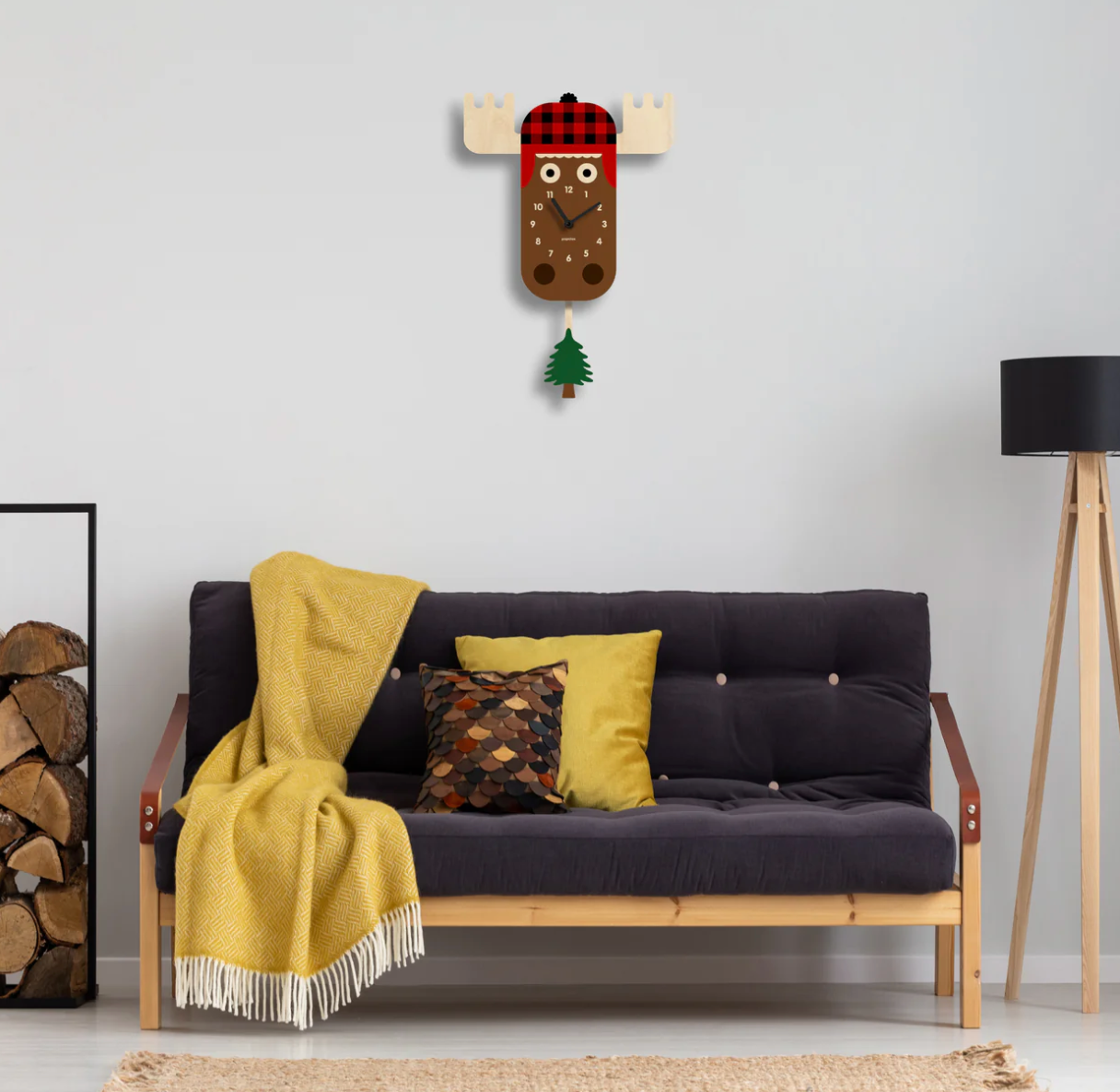 Expertly crafted with a cozy flannel winter hat, this moose pendulum wall clock adds a charming touch to any room. The swinging pine tree pendulum adds a whimsical element while keeping perfect time. A must-have for any cabin, winter or forest themed decor.