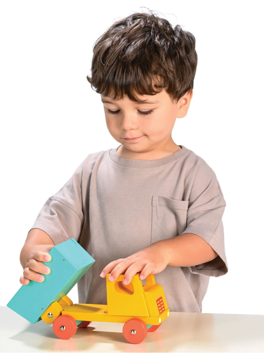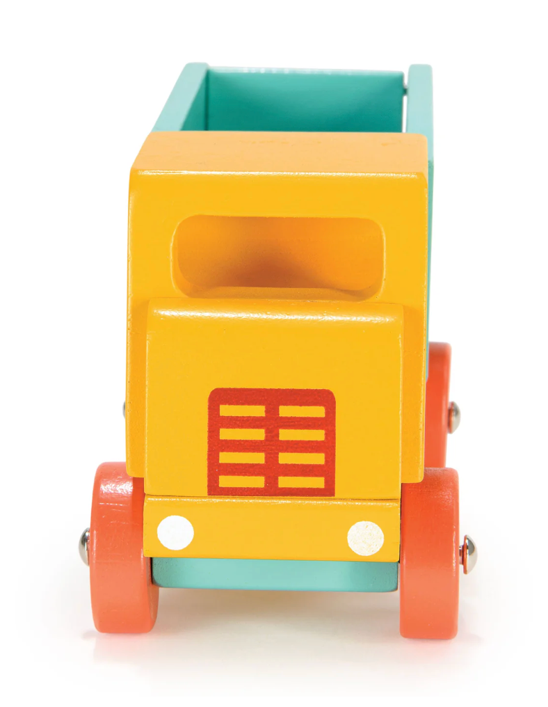 Based on a retro design, the simple clean lines give this traditional toy a refreshing look and feel. A classic big yellow lorry with tipping back part and orange wheels.