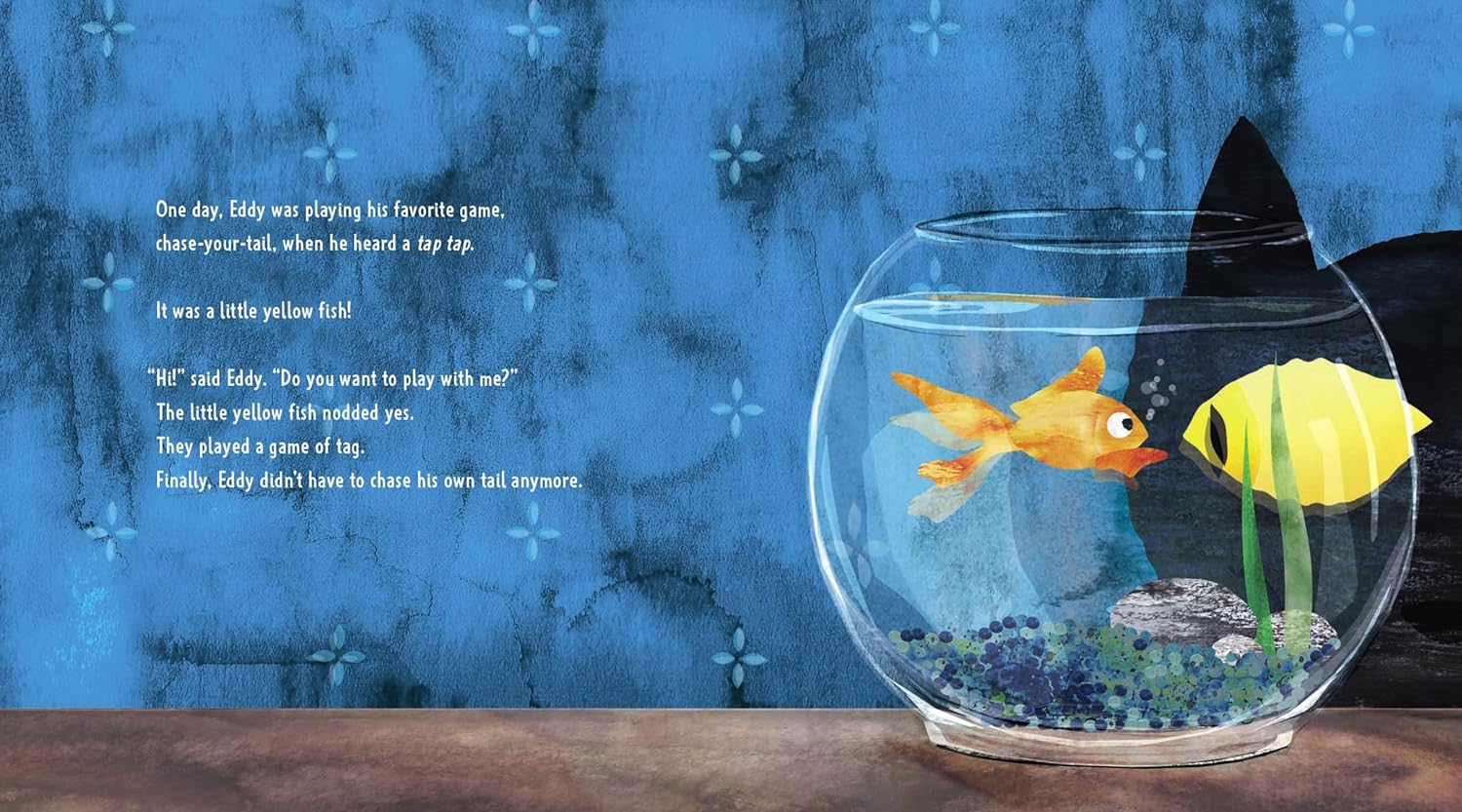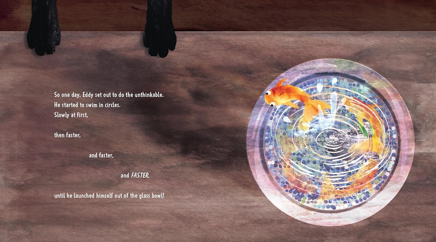 Eddy is a lonely goldfish stuck inside his fishbowl. He would love to have a friend to swim and play and blow bubbles with. Soon, on the other side of the glass, he spies not one but two new friends. After days of playing games together, Eddy leaps out of his bowl to be closer to them. And that’s when he realizes that his two friends are really the inquisitive eyes of A CAT! Oh, no! Luckily for Eddy, friendship can be found in unexpected places.