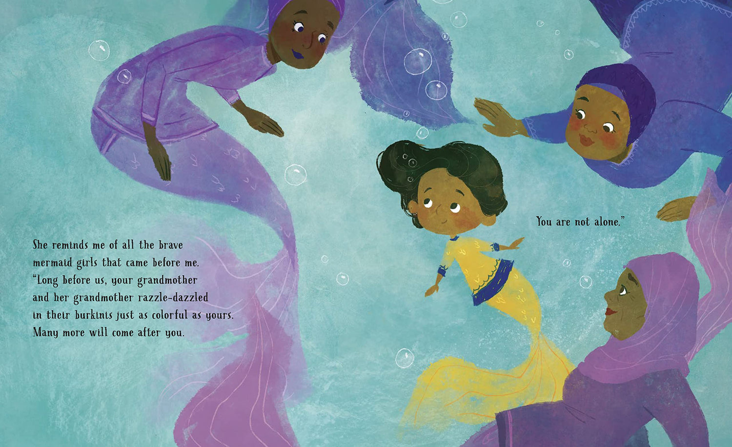 Luckily Mama helps Heba to find strength in the mermaid girls who came before her. Feeling more connected to the women of her family, Heba is ready to show her friends that she can do all the same things that they can do—handstands, summersaults, and dives off the diving board—even while wearing her yellow burkini.