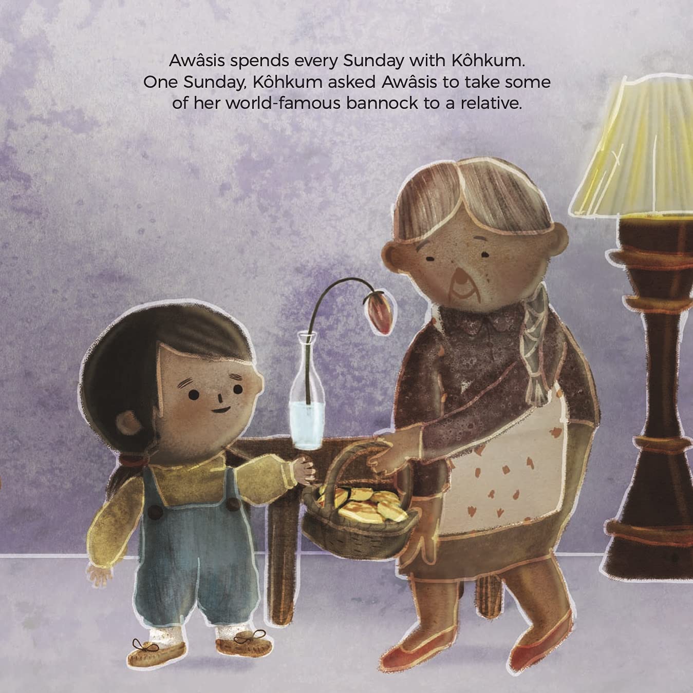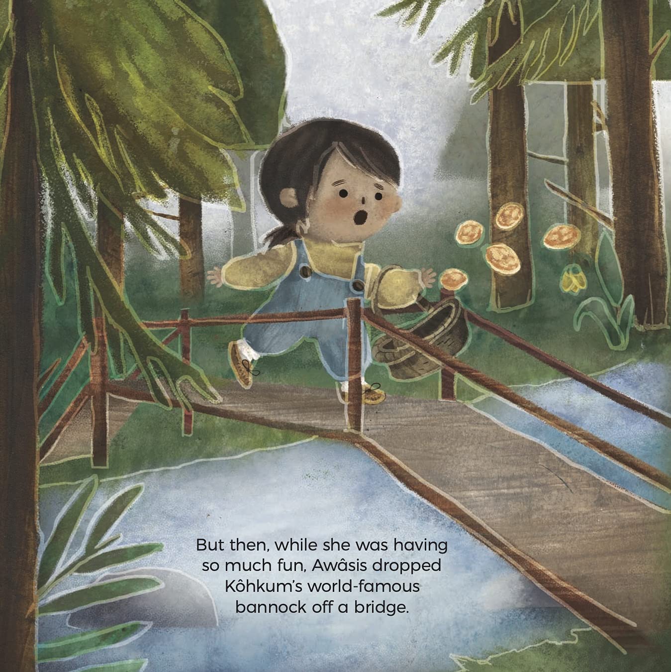 During an unfortunate mishap, young Awâsis loses Kôhkum’s freshly baked world-famous bannock. Not knowing what to do, Awâsis seeks out a variety of other-than-human relatives willing to help. What adventures are in store for Awâsis?