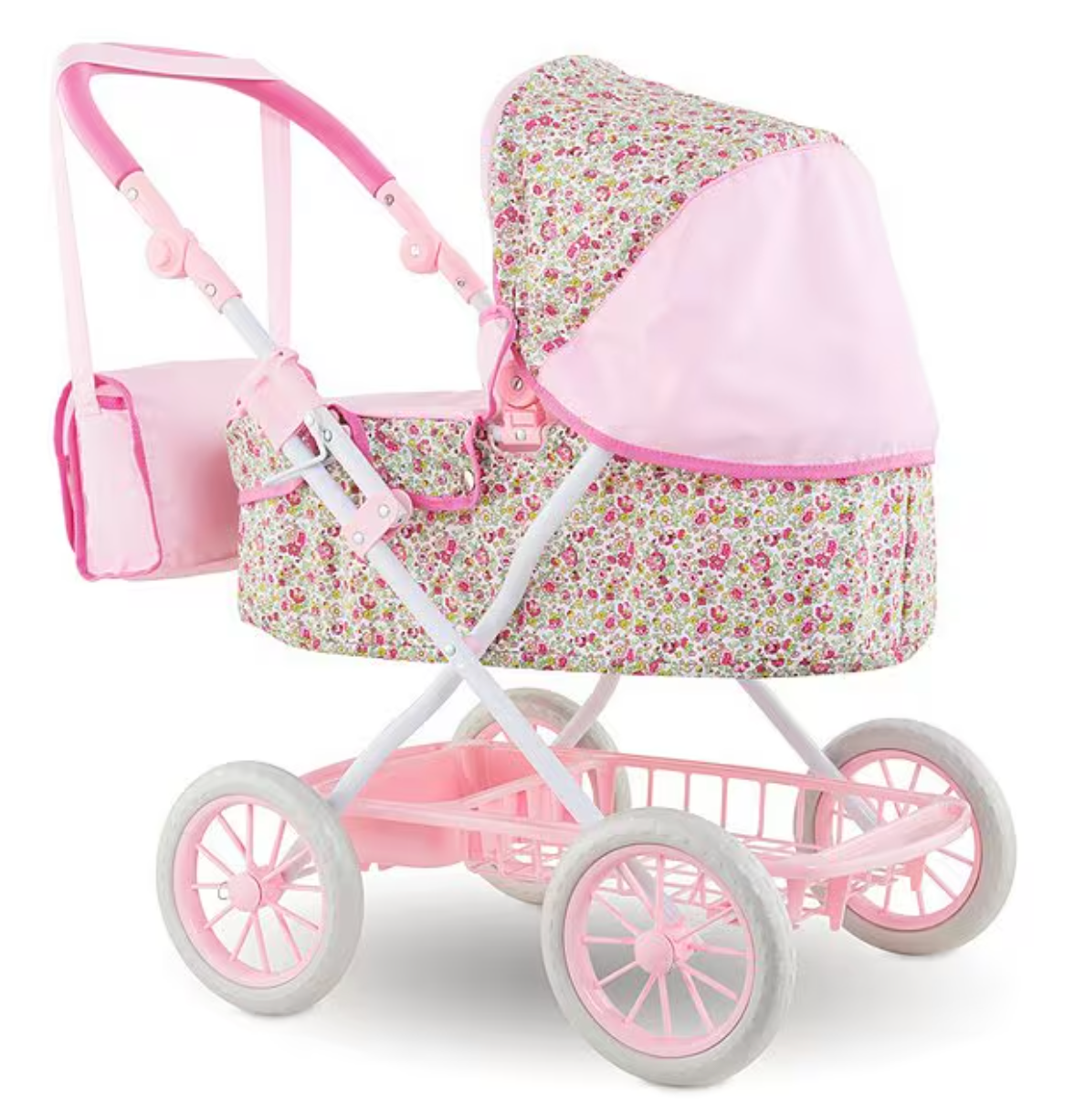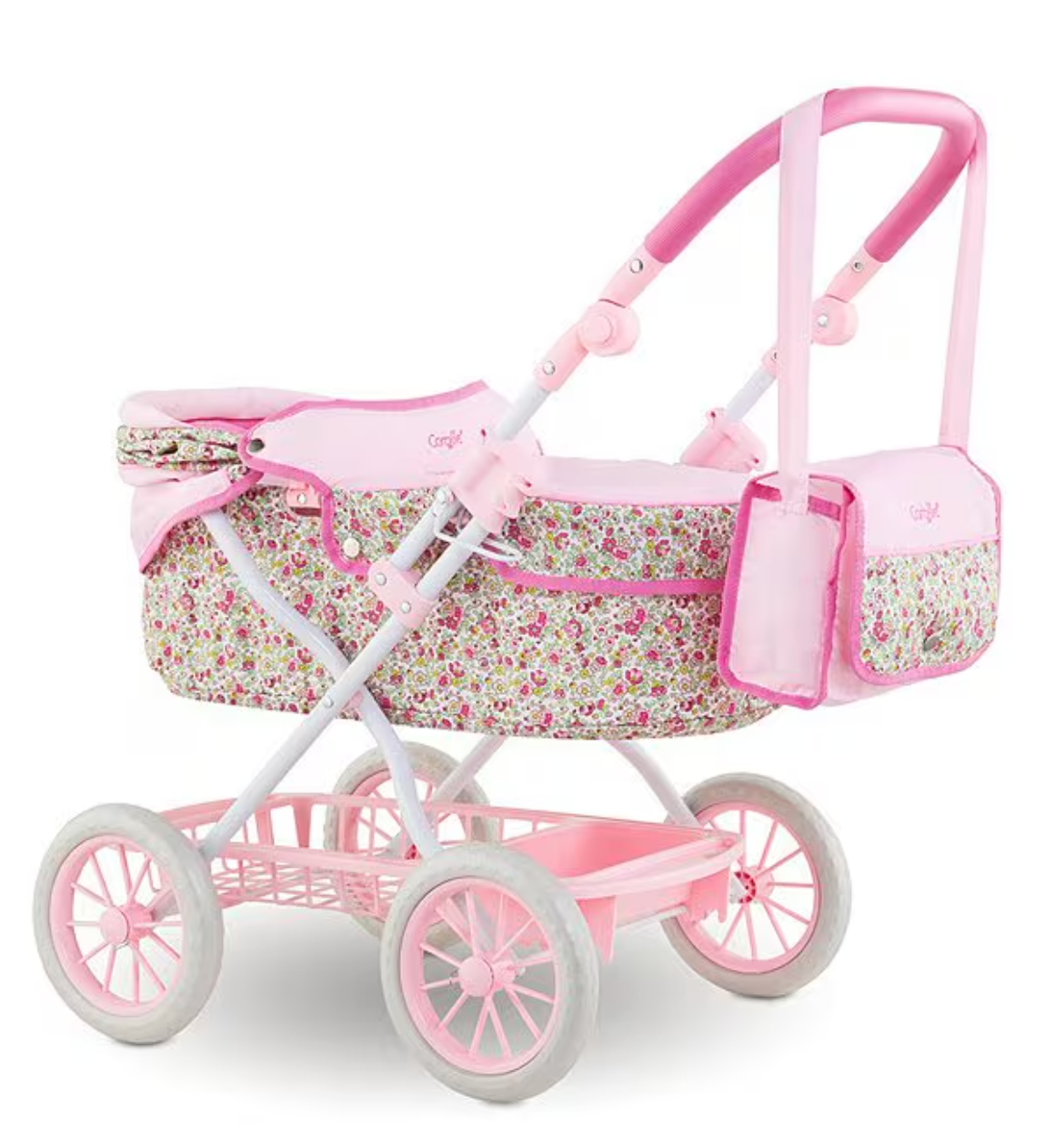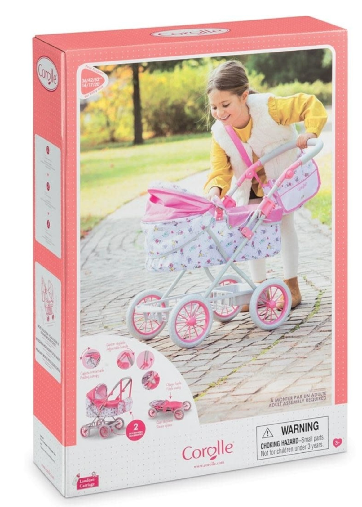 It's time for a walk and Kids will love taking their favorite 14" - 20" baby doll for a stroll in style. Its handle height is adjustable from 14" to 29.5" to accommodate children as they grow. It has an adjustable hood, a storage basket for baby's things, a removable bassinet cover and comes complete with a matching nursery bag. When playtime is over, the carriage folds easily for space-efficient storage. It's part of the Mon Grand Poupon Corolle Collection of dolls, fashions and accessories to help little ones take care of their baby doll the way their parents take care of them.
