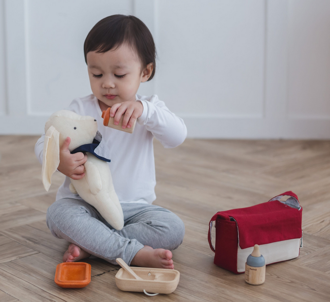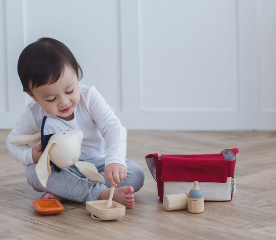 It’s feeding time! The Plan Toys Baby Feeding Set is the perfect little toy for your little one's pretend play. This Doll Feeding Set comes with a bag, which can be hung on a stroller, a food-storage container, spoon, bib, water bottle, and feeding bottle. The set helps children to develop a sense of love and care through role-play.