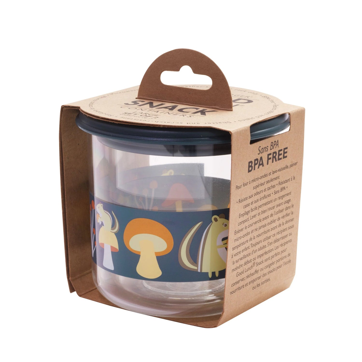 The Mostly Mushroom Good Lunch® Snack Containers feature happy chipmunks foraging in a field of mushrooms. Good Lunch® Snack Containers are clear, durable, leak-proof, and eliminate the need for plastic bags and keeps food fresh and organized.