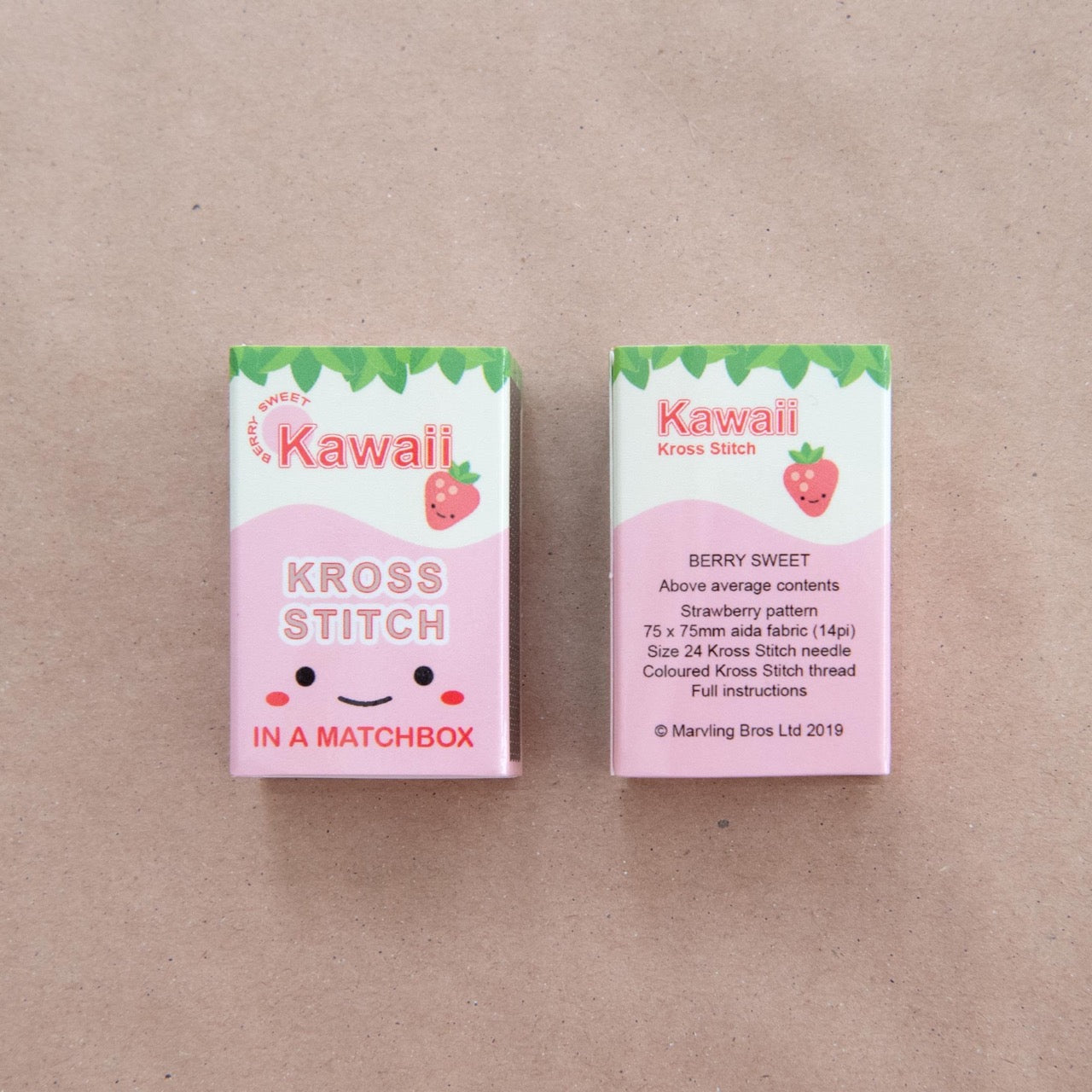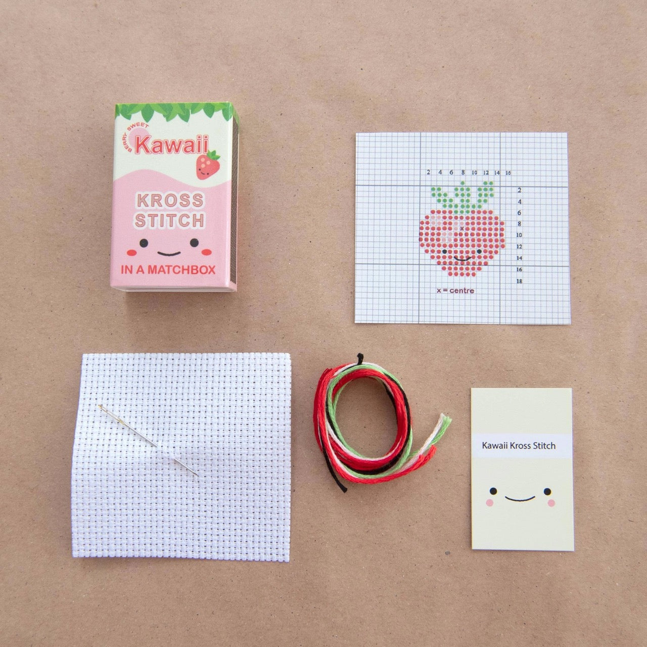 A super cute cross stitch kit gift, with a berry cute strawberry pattern perfect for beginners or enthusiasts wanting a quick project. Everything you need to make this mini Kawaii Strawberry style cross stitch pattern is packed neatly into a matchbox. With easy to follow instructions, this gift is sure to delight any enthusiast or entice a newbie into the wonderful world of cross stitch. The kit includes: 65mm x 65mm square 14 count blank Aida - pre folded to mark center start point Embroidery threads needed to make pattern. Size 24 tapestry needle Easy to follow pattern marked in color on counted graph Full instructions and project ideas for the finished piece. Dimensions: matchbox is 55mm x 36mm x 16mm, Aida is 65mm x 65mm, finished cross stitch pattern is 3cm, threads in strands of six and are 33cm long. Ages 6 and up. Made in the UK