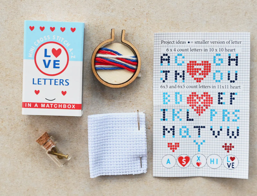 A complete cross stitch kit with everything you need all packed into a tiny matchbox.