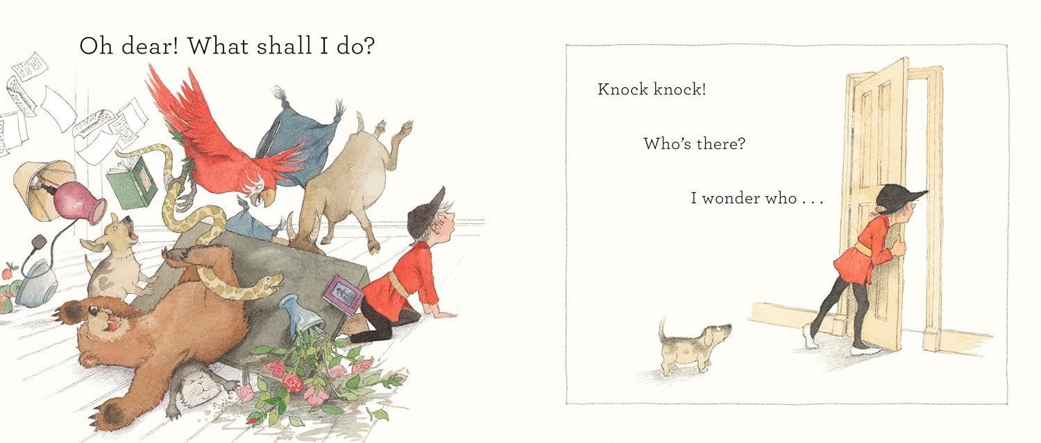 As a hapless boy goes from shop to shop, requesting a series of perfectly reasonable items—a hat, a coat, a cake, a chair—he finds himself thwarted at every turn, amassing instead a growing menagerie of animals who happily follow him on his errands. It’s not until he finally asks for a cup that he’s proffered a wriggly creature that solves his dilemma . . . or does it? Adding delicious momentum to Michael Rosen’s rhymes (and mastery of the page turn) are an expressive crew of animal characters rendered as only Helen Oxenbury can, making for a timeless story guaranteed to beg many repeat readings. Oh dear!