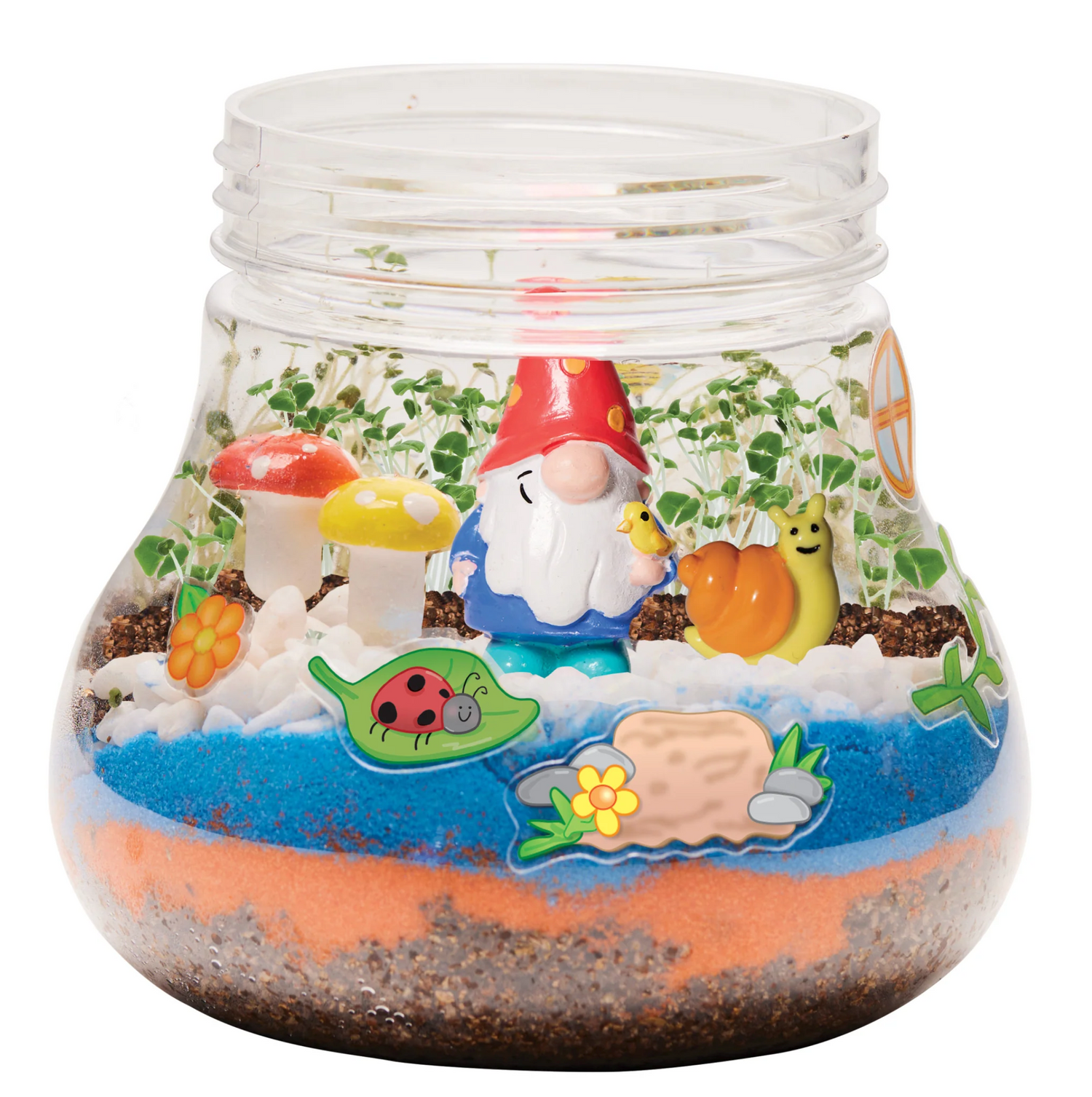 Contents Include: 1 Plastic mushroom shaped terrarium, 1 Bag of potting mix, 1 Bag of chia seeds, 1 Bag of white stones, 2 Colors of art sand, 1 Gnome figurine, 1 Snail figurine, 1 Colorful sticker sheet, 1 Mushroom cap sticker sheet, 2 Mini mushrooms, 1 Water dropper and Instructions