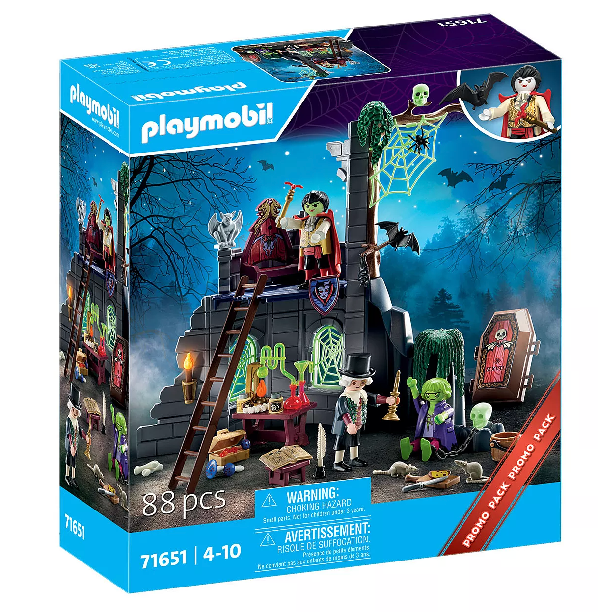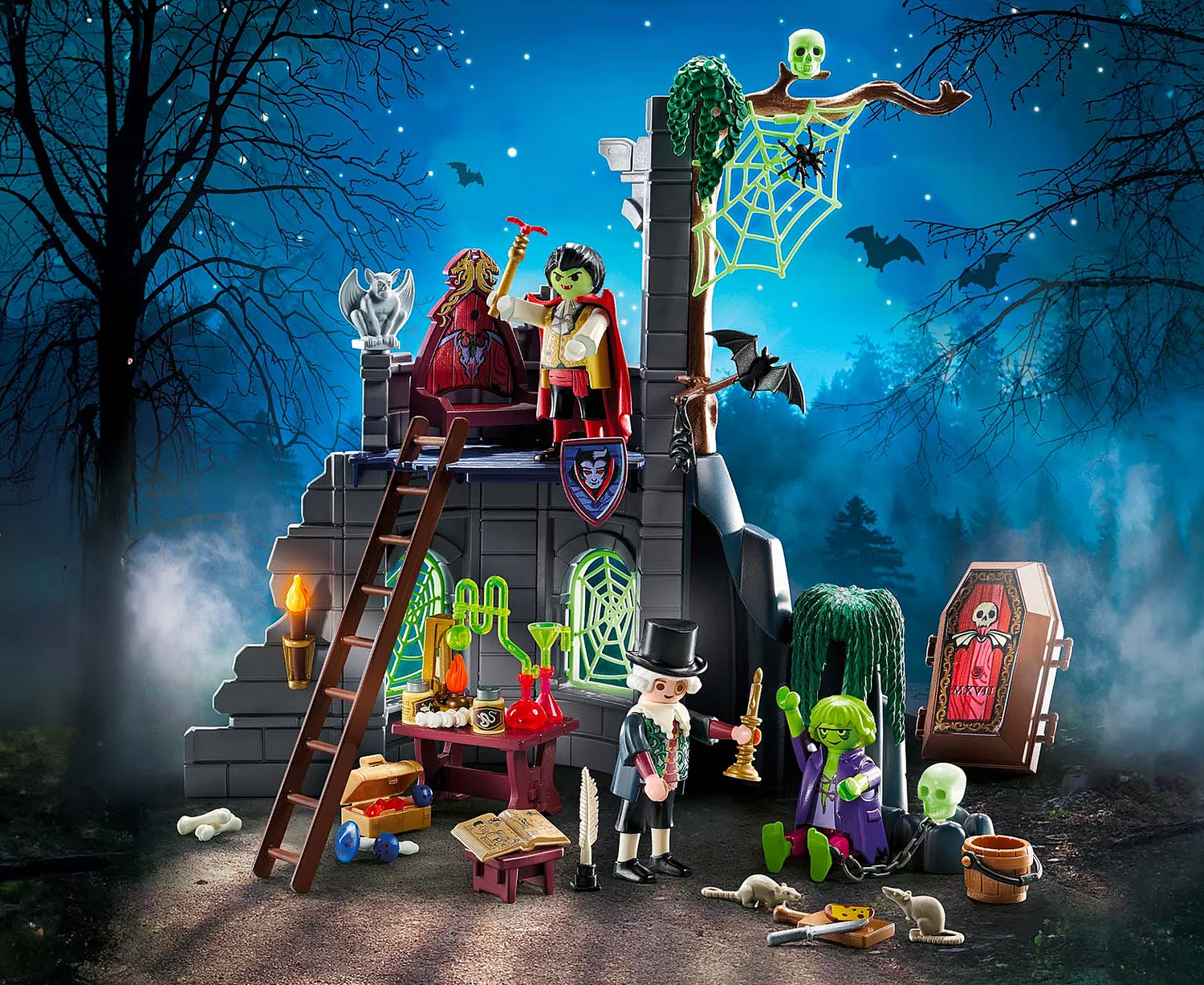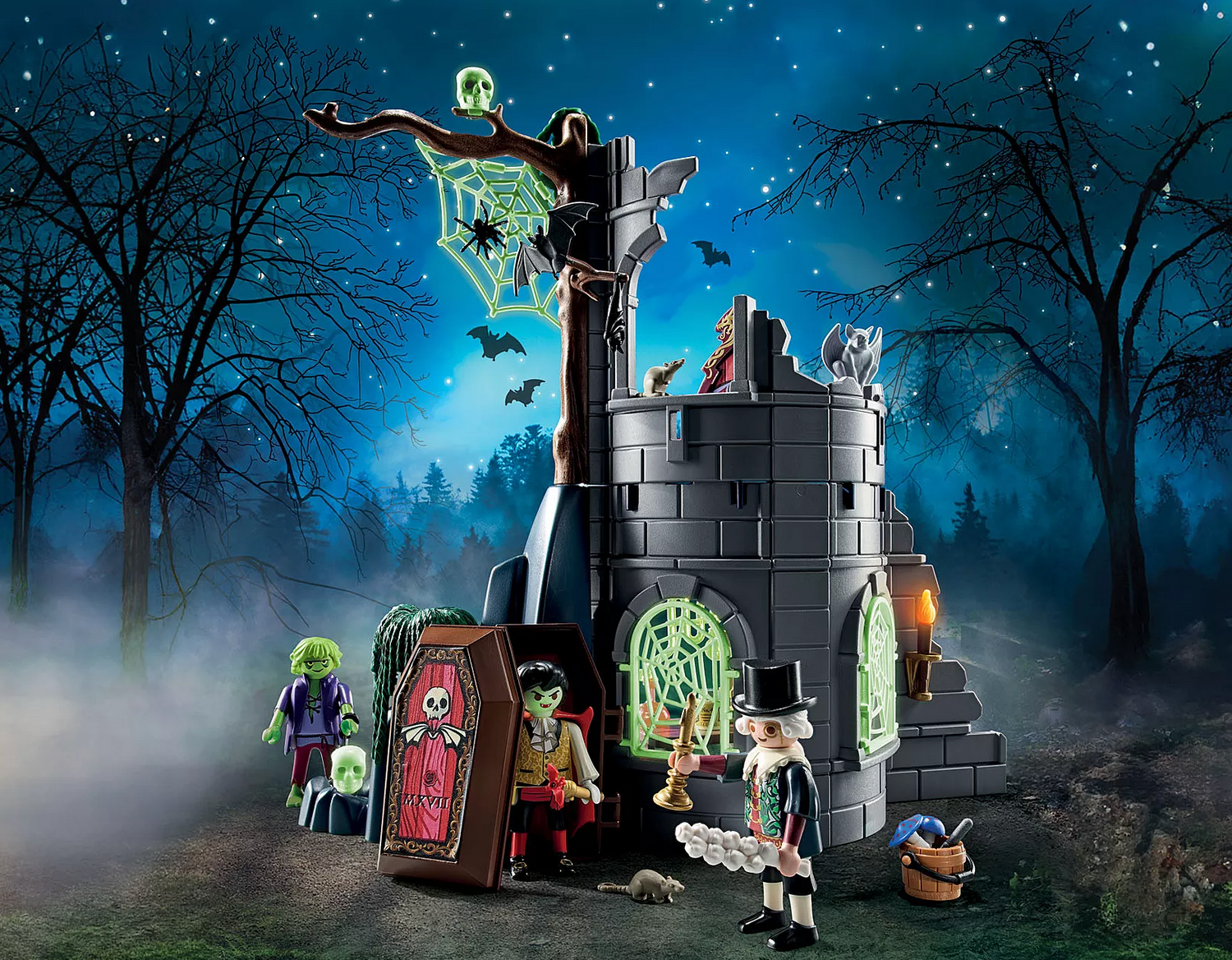 BEWARE! Enter if you dare into the Haunted Ruin! Once inside, Dracula climbs out of his underground coffin for a night of thrills and chills. He hangs upside down, turning into a bat just after midnight. The only way to ward him off is with the included garlic cloves, so use them wisely. Past the glow-in-the-dark cobwebs and spiders lies the green zombie who is hungry and only eats … brains. Don’t stay too long or you might never return. Set includes three figures, castle, coffin, glow-in-the-dark skull, and other accessories. Recommended for ages four to ten years.