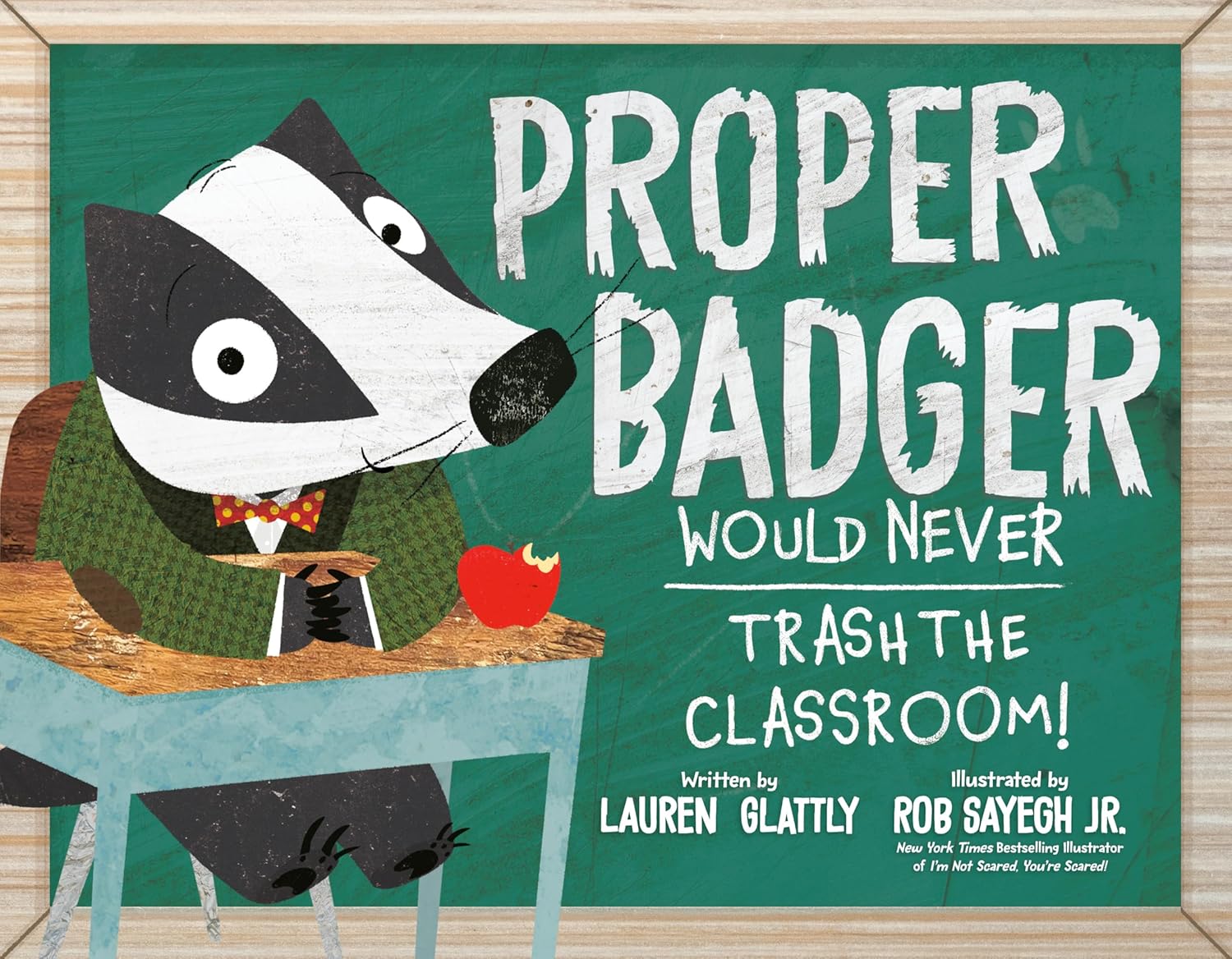 Proper Badger Would Never Trash the Classroom book cover with badger character at school desk and apple.