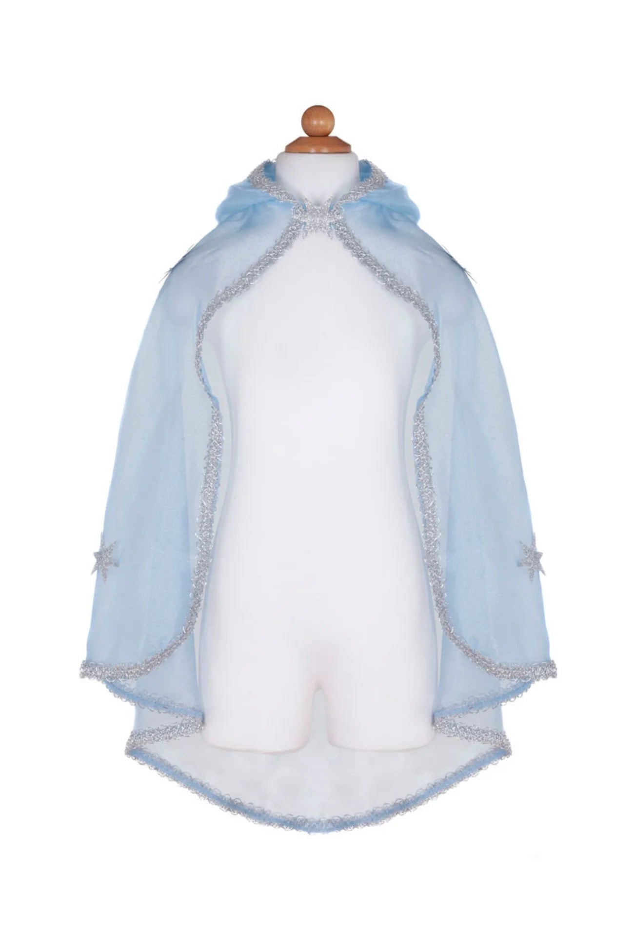 Cast icy spells with our classic Snow Queen Cape. Made from blue crystal organza, this cape features silver glitter sparkle stars, and a large hood. The entire cape is trimmed in silver braided trim for some extra added elegance. Size 3-4. Machine washable.